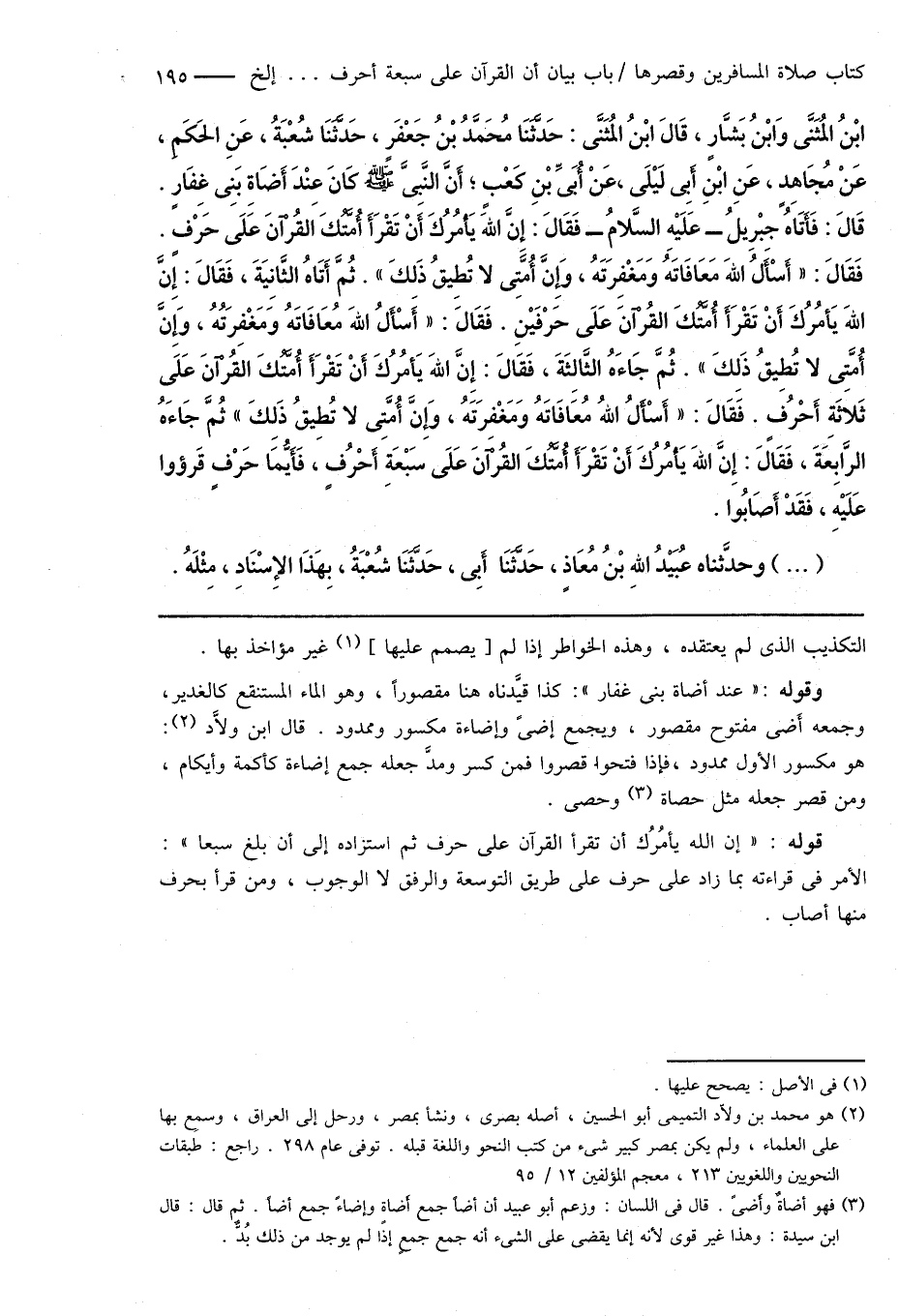 ابْنُ المُثَنَّى وَابْنُ بَشَّارٍ، قَالَ ابْنُ المُثَنَّى: حَدَّثَنَا مُحَمَّدُ بْنُ جَعْفَرٍ، حَدَّثَنَا شُعْبَةُ، عَنِ الحَكَمِ، عَنْ مُجَاهِدٍ، عَنِ ابْنِ أَبِى لَيْلَى، عَنْ أُبَىِّ بْنِ كَعْبٍ؛ أَنَّ النَّبِىَّ صَلَّى اللهُ عَلَيْهِ وَسَلَّمَ كَانَ عِنْدَ أَضَاة بَنِى غِفَارٍ. قَالَ: فَأَتَاهُ جِبْرِيلُ - عَلَيْهِ السَّلامُ - فَقَالَ: إِنَّ اللهَ يَأْمُرُكَ أَنْ تَقْرَأَ أُمَّتُكَ القُرْآنَ عَلَى حَرْفٍ. فَقَالَ: " أَسْأَلُ اللهَ مَعَافَاتَهُ وَمَغْفِرَتَهُ، وَإِنَّ أُمَّتِى لا تُطِيقُ ذَلِكَ ". ثُمَّ أَتَاهُ الثَّانِيَةَ، فَقَالَ: إِنَّ اللهَ يَأمُرُكَ أَنْ تَقْرَأَ أُمَّتُكَ القُرْآنَ عَلَى حَرْفَيْنِ. فَقَالَ: " أَسْأَلُ اللهَ مُعَافَاتَهُ وَمَغْفِرَتُهُ، وَإِنَّ أُمَّتِى لا تُطِيقُ ذَلِكَ ". ثُمَّ جَاءَهُ الثَّالِثَةَ، فَقَالَ: إِنَّ اللهَ يَأمُرُكَ أَنْ تَقْرَأَ أُمَّتُكَ القُرْآنَ عَلَى ثَلاثَةِ أَحْرُفٍ. فَقَالَ: " أَسْأَلُ اللهُ مُعَافَاتَهُ وَمَغْفِرَتَهُ، وَإِنَّ أُمَّتِى لا تُطِيقُ ذَلِكَ " ثُمَّ جَاءَهُ الرَّابِعَةَ، فَقَالَ: إِنَّ اللهَ يَأْمُرُكَ أَنْ تَقْرَأَ أُمَّتُكَ القُرْآنَ عَلَى سَبْعَةِ أَحْرُفٍ، فَأَيُّمَا حَرْفٍ قَرؤوا عَلَيْهِ، فَقَدْ أَصَابُوا.