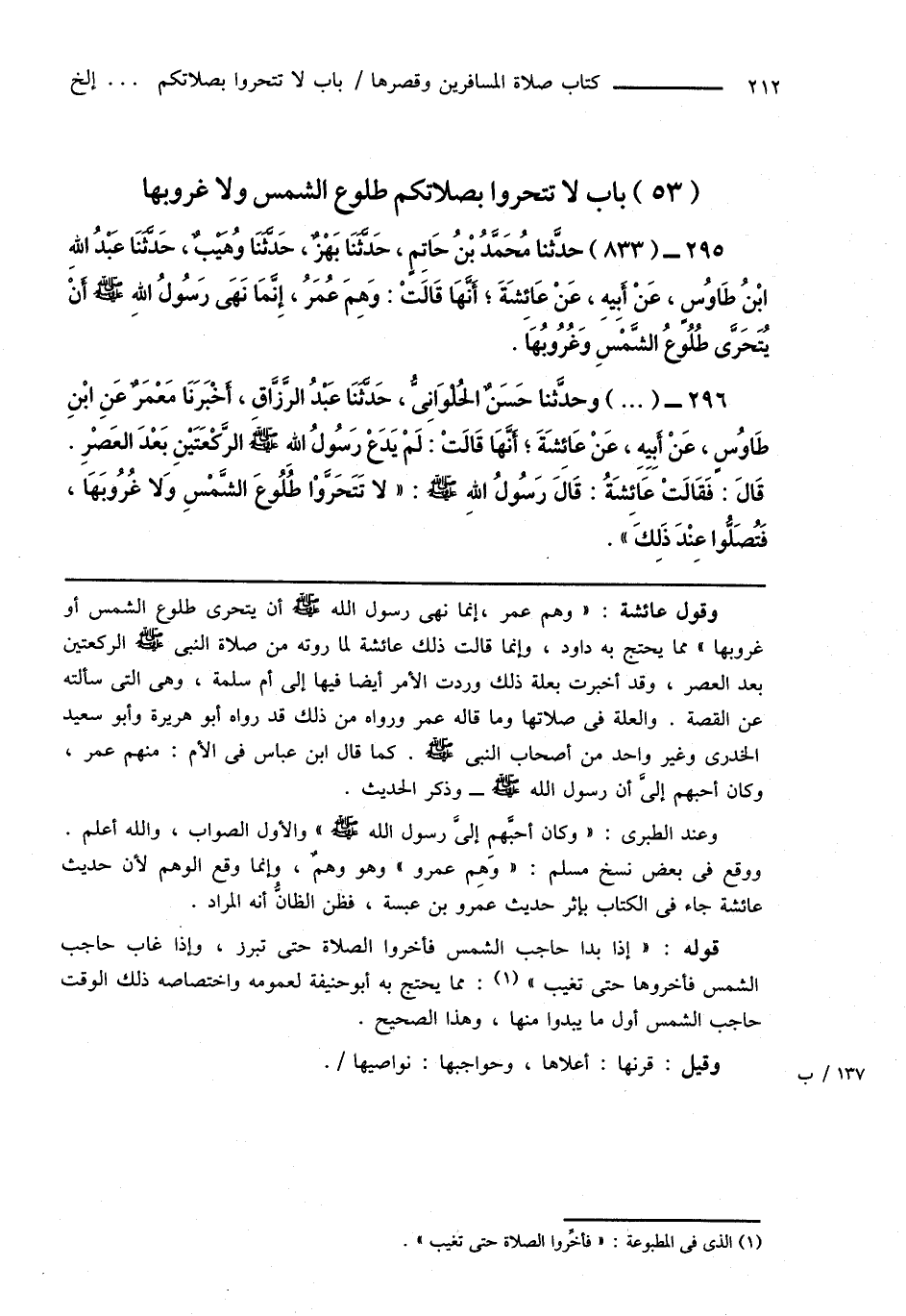 295 - (833) حدَّثنا مُحَمَّدُ بْنُ حَاتِمٍ، حَدَّثَنَا بَهْزٌ، حَدَّثَنَا وُهَيْبٌ، حَدَّثَنَا عَبْدُ اللهِ ابْنُ طَاوُسٍ، عَنْ أَبِيهِ، عَنْ عَائِشَةَ؛ أَنَّهَا قَالَتْ: وَهِمَ عُمَرُ، إِنَّمَا نَهَى رَسُولُ اللهِ صَلَّى اللهُ عَلَيْهِ وَسَلَّمَ أَنْ يُتَحَرَّى طُلُوعُ الشَّمْسِ وَغُرُوبُهَا.