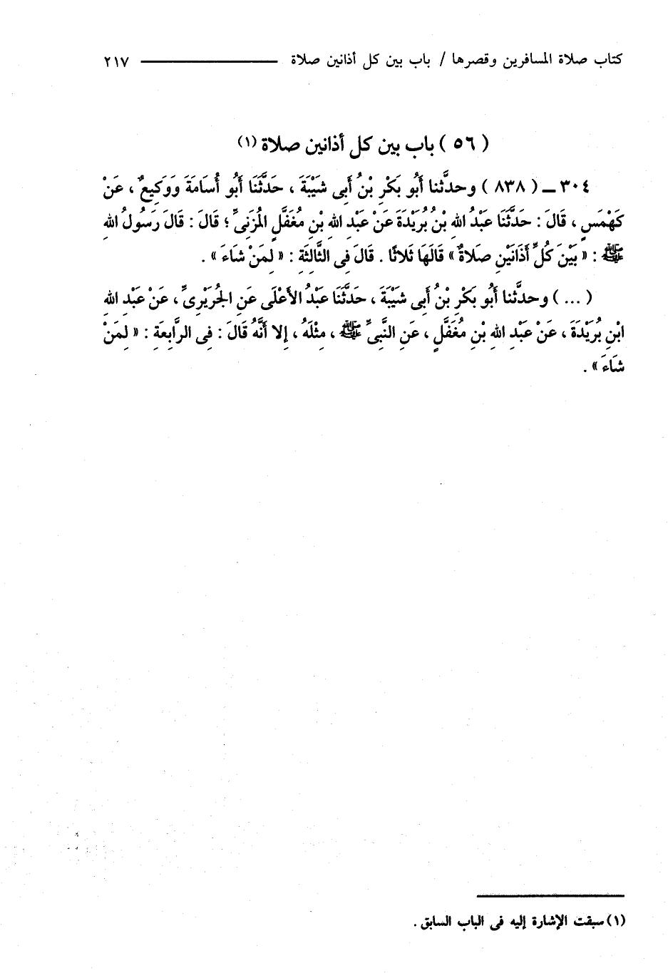 304 - (838) وحدَّثنا أَبُو بَكْرِ بْنُ أَبِى شَيْبَةَ، حَدَّثَنَا أَبُو أُسَامَةَ وَوَكِيعٌ، عَنْ كَهْمَسٍ، قَالَ: حَدَّثَنَا عَبْدُ اللهِ بْنُ بُرَيْدَةَ عَنْ عَبْدِ اللهِ بْنِ مُغَفَّلٍ المُزَنِىِّ؛ قَالَ: قَالَ رسُولُ اللهِ صَلَّى اللهُ عَلَيْهِ وَسَلَّمَ: " بَيْنَ كُلِّ أَذَانَيْنِ صَلاةٌ " قَالَهَا ثَلاثًا. قَالَ فِى الثَّالِثَةِ: " لِمَنْ شَاءَ ".
