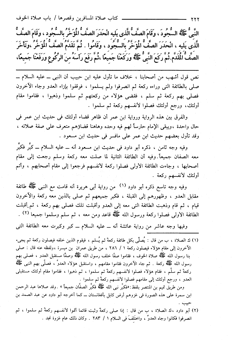 (¬2) أبو داود، ك الصلاة، ب من قال: إذا صلى ركعةً وثبت قائماً أتموا لأنفسهم ركعةً ثم سلموا، ثم انصرفوا فكانوا وجاه العدوِّ، واختَلِفَ فى السلام 1/ 283. وكان ذلك عام غزوة نجد.