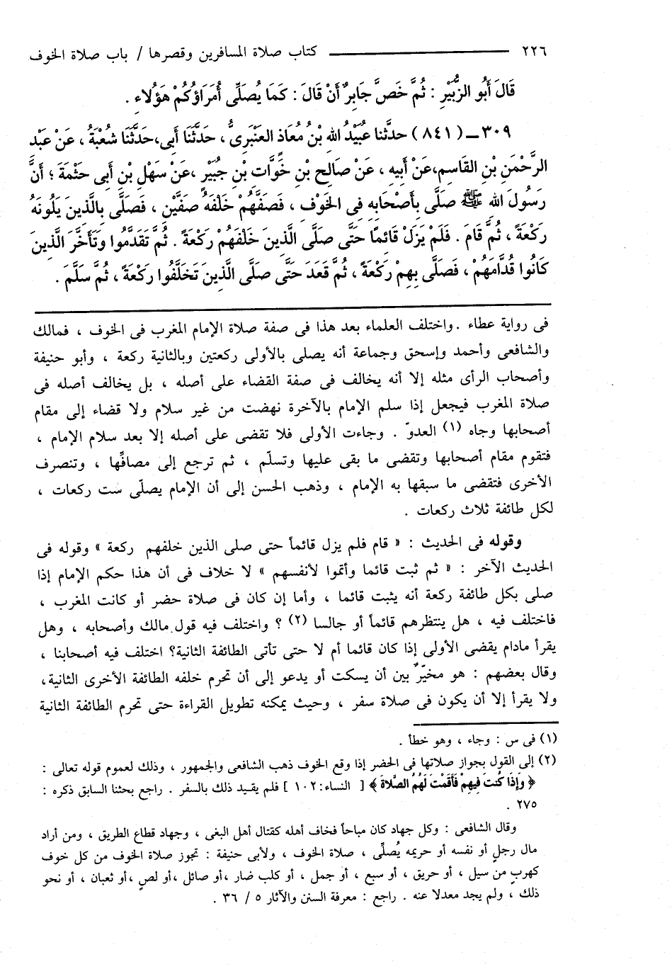 (¬2) إلى القول بجواز صلاتها فى الحضر إذا وقع الخوف ذهب الشافعى والجمهور، وذلك لعموم قوله تعالى: {وَإِذَا كُنتَ فِيهِمْ فَأَقَمْتَ لهم الصَّلاةَ} [النساء: 102] فلم يقيد ذلك بالسفر. راجع بحثنا السابق ذكره: 275.