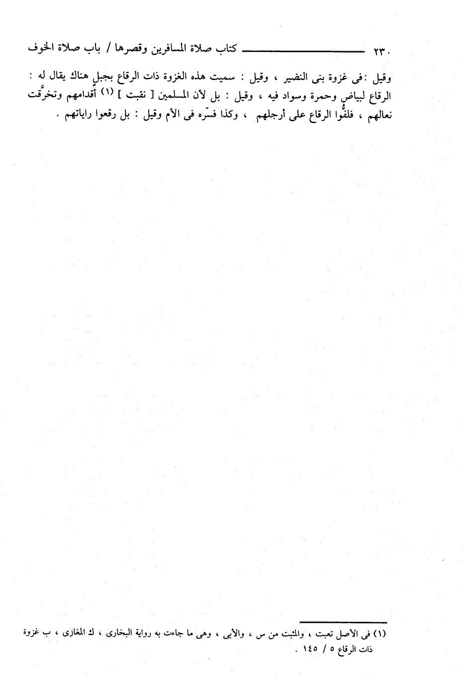 وقيل: فى غزوة بنى النضير، وقيل: سميت هذه الغزوة ذات الرقاع بجبلٍ هناك يقال له: الرقاع لبياض وحمرة وسواد فيه، وقيل: بل لأن المسلمين [نقبت] (¬1) أقدامهم وتخرَّقت نعالهم، فلفُّوا الرقاع على أرجلهم، وكذا فسّره فى الأم وقيل: بل رقعوا راياتهم.