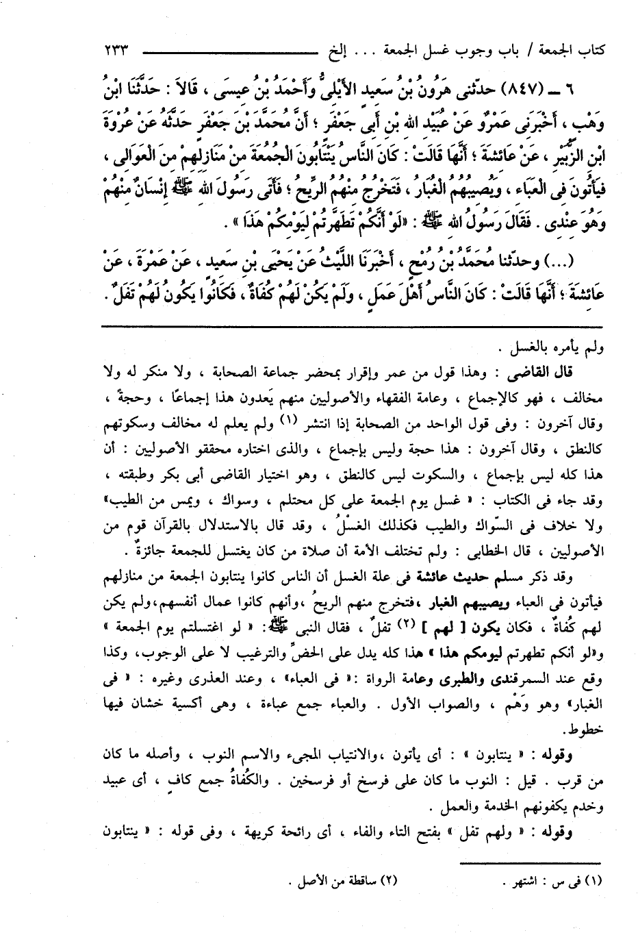 وقد ذكر مسلم حديث عائشة فى علة الغسل أن الناس كانوا ينتابون الجمعة من منازلهم فيأتون فى العباء ويصيبهم الغبار، فتخرج منهم الريحُ، وأنهم كانوا عمال أنفسهم، ولم يكن لهم كُفاةٌ، فكان يكون [لهم] (¬2) تفلٌ، فقال النبى صَلَّى اللهُ عَلَيْهِ وَسَلَّمَ: " لو اغتسلتم يوم الجمعة " و" لو أنكم تطهرتم ليومكم هذا " هذا كله يدل على الحضِّ والترغيب لا على الوجوب، وكذا وقع عند السمرقندى والطبرى وعامة الرواة: " فى العباء "، وعند العذرى وغيره: " فى الغبار " وهو وَهْم، والصواب الأول. والعباء جمع عباءة، وهى أكسية خشان فيها خطوط.