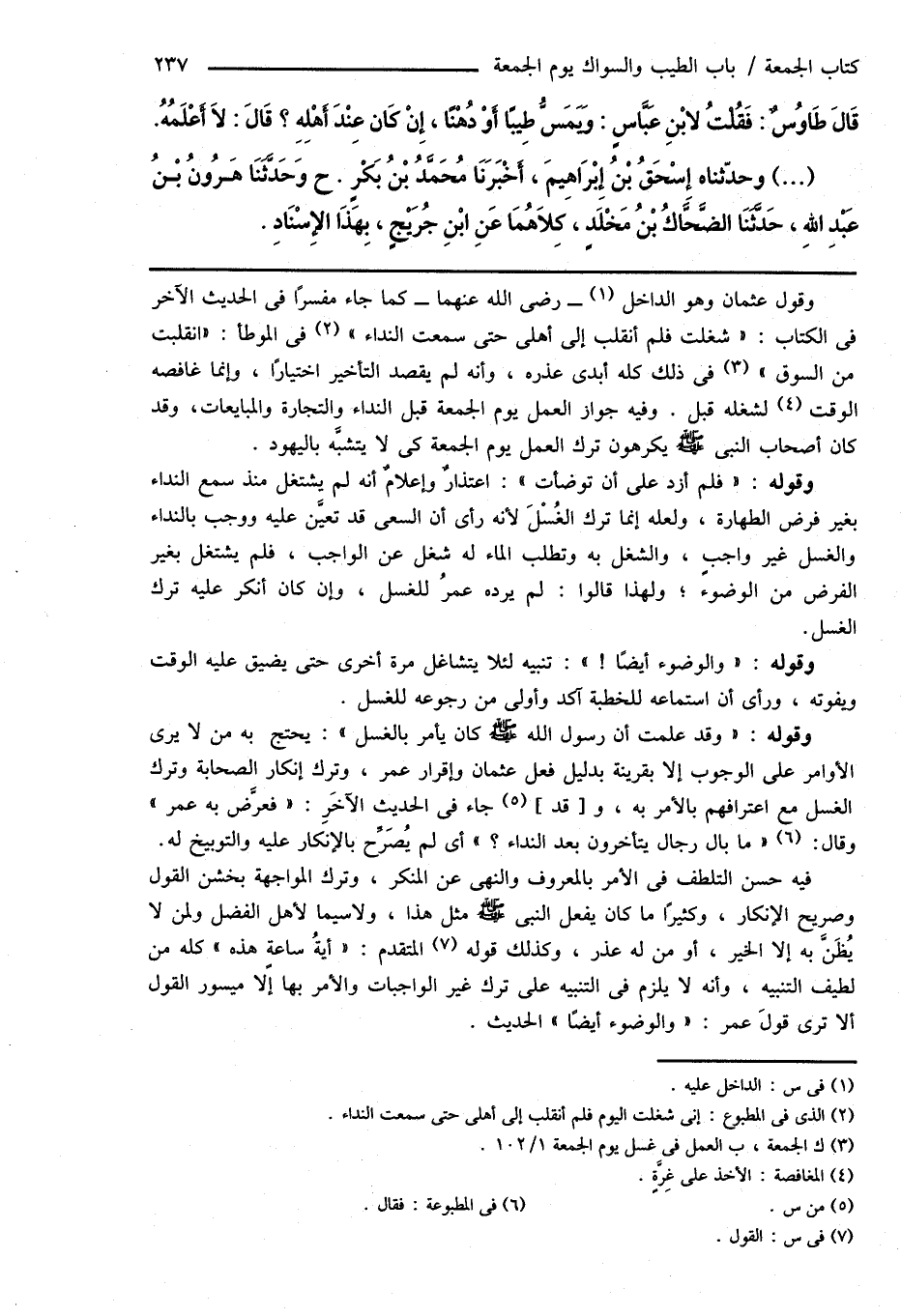 وقول عثمان وهو الداخل (¬1) - رضى الله عنهما - كما جاء مفسرًا فى الحديث الآخر فى الكتاب: " شغلت فلم أنقلب إلى أهلى حتى سمعت النداء " (¬2) فى الموطأ: " انقلبت من السوق " (¬3) فى ذلك كله أبدى عذره، وأنه لم يقصد التأخير اختيارًا، وإنما غافصه الوقت (¬4) لشغله قبل. وفيه جواز العمل يوم الجمعة قبل النداء والتجارة والمبايعات، وقد كان أصحاب النبى صَلَّى اللهُ عَلَيْهِ وَسَلَّمَ يكرهون ترك العمل يوم الجمعة كى لا يتشبَّه باليهود.