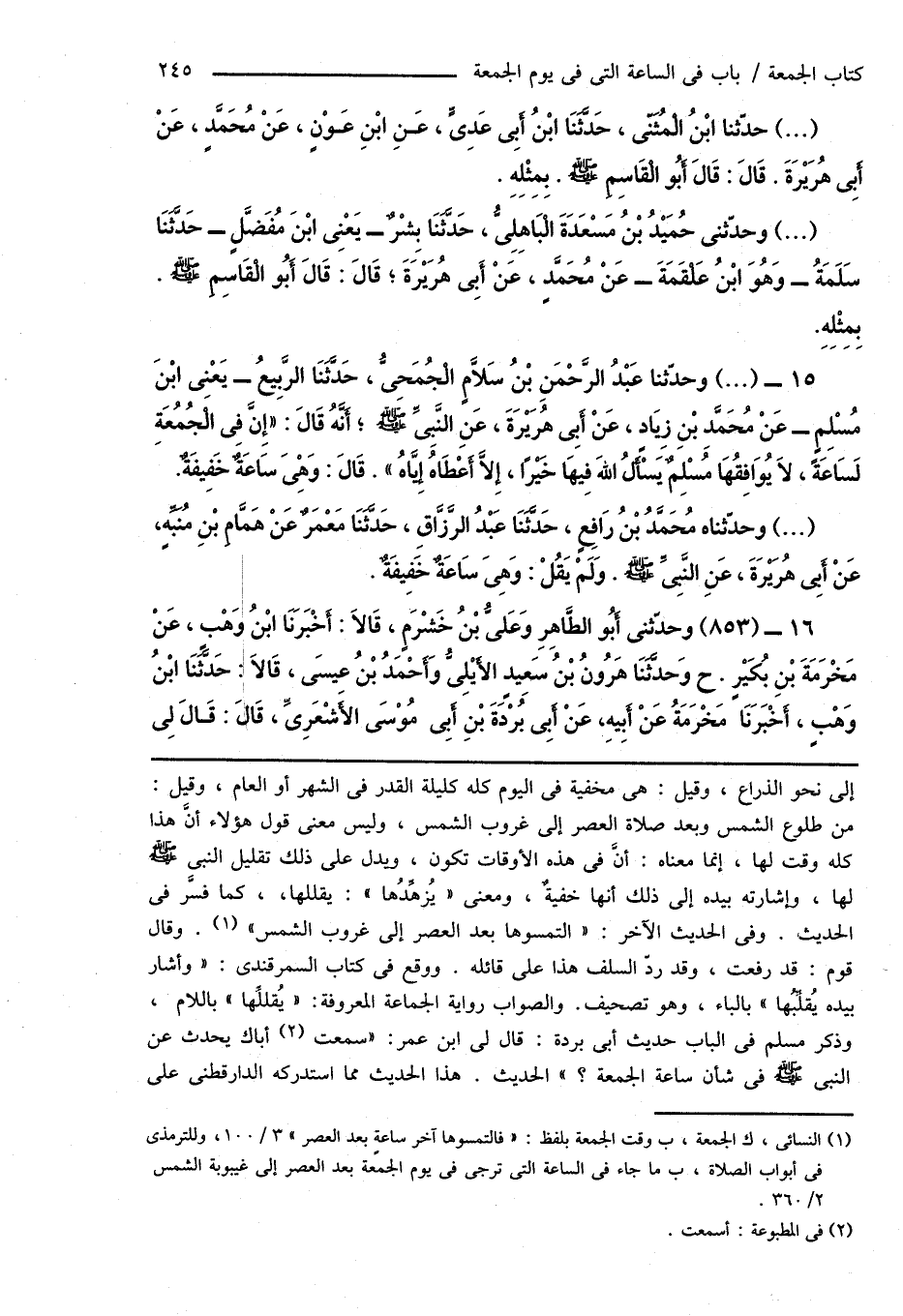 (¬1) النسائى، ك الجمعة، ب وقت الجمعة بلفظ: " فالتمسوها آخر ساعةٍ بعد العصر " 3/ 100، وللترمذى فى أبواب الصلاة، ب ما جاء فى الساعة التى ترجى فى يوم الجمعة بعد العصر إلى غيبوبة الشمس 2/ 360.