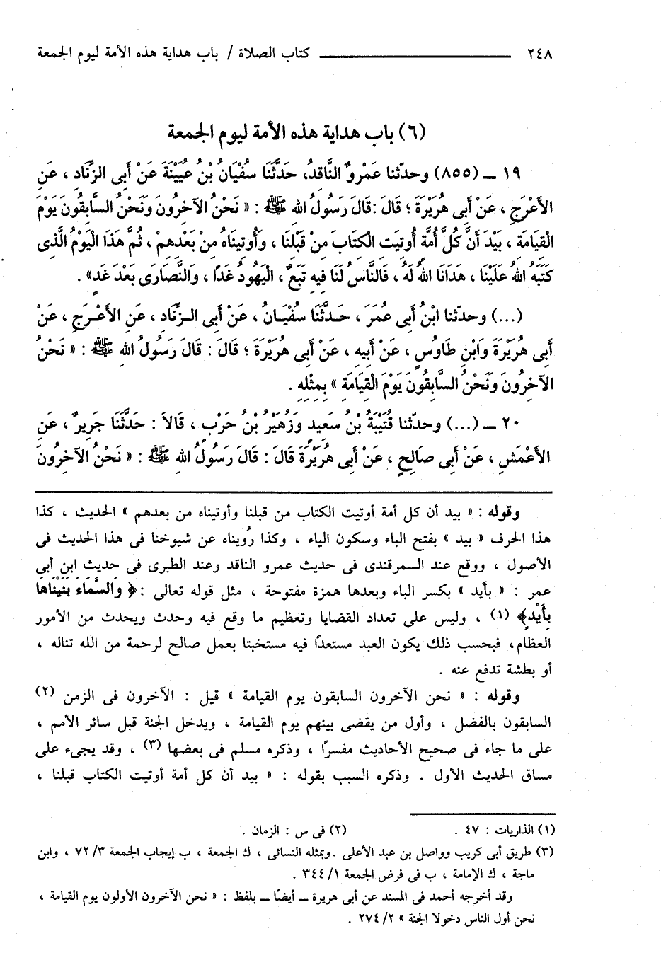 19 - (855) وحدّثنا عَمْرٌو النَّاقِدُ، حَدَّثَنَا سُفْيَانُ بْنُ عُيَيْنَةَ عَنْ أَبِى الزِّنَادِ، عَنِ الأَعْرَجِ، عَنْ أَبِى هُرَيْرَةَ؛ قَالَ: قَالَ رَسُولُ اللهِ صَلَّى اللهُ عَلَيْهِ وَسَلَّمَ: " نَحْنُ الآخِرُونَ وَنَحْنُ السَّابِقُونَ يَوْمَ الْقِيَامَةِ، بَيْدَ أَنَّ كُلَّ أُمَّةٍ أُوتِيَتِ الْكِتَابَ مِنْ قَبْلِنَا، وَأُوتِينَاهُ مِنْ بَعْدِهِمْ، ثُمَّ هَذَا الْيَوْمُ الَّذِى كَتَبَهُ اللهُ عَلَيْنَا، هَدَانَا اللهُ لَهُ، فَالنَّاسُ لَنَا فِيهِ تَبَعٌ، الْيَهُودُ غَدًا، وَالنَّصَارَى بَعْدَ غَدٍ ".