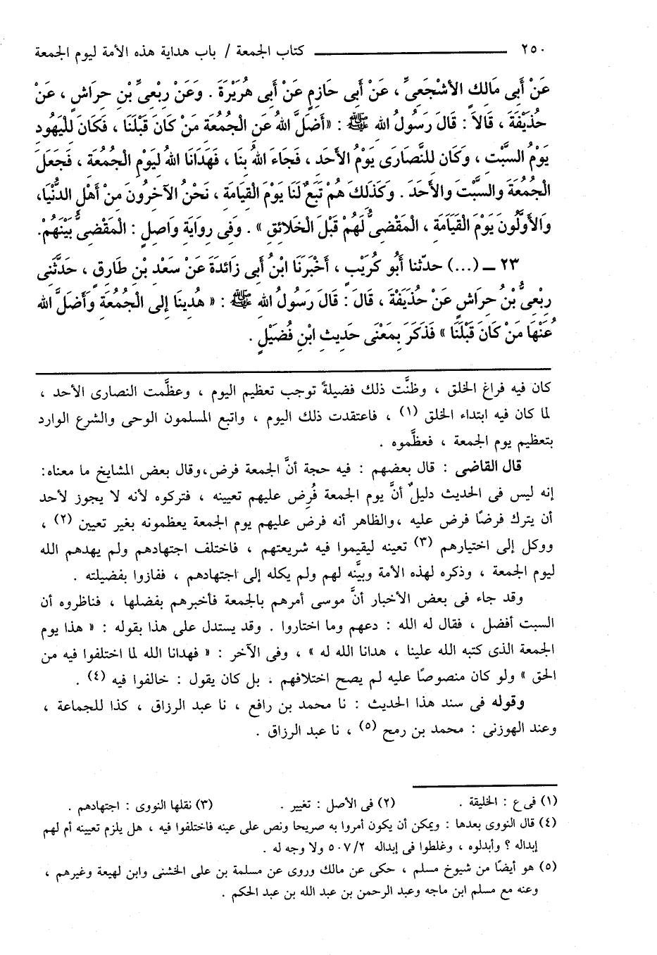 عَنْ أَبِى مَالِكٍ الأَشْجَعِىِّ، عَنْ أَبِى حَازِمٍ عَنْ أَبِى هُرَيْرَةَ. وَعَنْ رِبْعِىِّ بْنِ حِرَاشٍ، عَنْ حُذَيفَةَ، قَالَا: قَالَ رَسُولُ اللهِ صَلَّى اللهُ عَلَيْهِ وَسَلَّمَ: " أَضَلَّ اللهُ عَنِ الْجُمُعَةِ مَنْ كَانَ قَبْلَنَا، فَكَانَ لِلْيَهُودِ يَوْمُ السَّبْتِ، وَكَان لِلنَّصَارَى يَوْمُ الأَحَدِ، فَجَاءَ اللهُ بِنَا، فَهَدَانَا اللهُ لِيَوْمِ الْجُمُعَةِ، فَجَعَلَ الْجُمُعَةَ وَالسَّبْتَ وَالأَحَدَ. وَكذَلكَ هُمْ تَبَعٌ لَنَا يَوْمَ الْقِيَامَةِ، نَحْنُ الآخِرُونَ من أَهْلِ الدُّنْيَا، وَالأَوَّلُونَ يَوْمَ الْقِيَامَةِ، الْمَقْضِىُّ لَهُمْ قَبْلَ الْخَلائِقِ ". وَفِى رِوَايَةِ وَاصِلٍ: الْمَقْضِىُّ بَينَهُمْ.