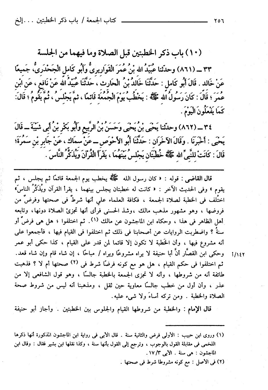 33 - (861) وحدّثنا عُبَيْدُ اللهِ بْنُ عُمَرَ الْقَوَارِيرِىُّ وَأَبُو كَامِلٍ الْجَحْدَرِىُّ، جَمِيعًا عَنْ خَالِدٍ. قَالَ أَبُو كَامِلٍ: حَدَّثَنَا خَالِدُ بْنُ الْحَارِثِ، حَدَّثَنَا عُبَيْدُ اللهِ عَنْ نَافِعٍ، عَنِ ابْنِ عُمَرَ؛ قَالَ: كَانَ رَسُولُ اللهِ صَلَّى اللهُ عَلَيْهِ وَسَلَّمَ: يَخْطُبُ يَوْمَ الْجُمُعَةِ قَائِمًا، ثُمَّ يَجْلِسُ، ثُمَّ يَقُومُ؛ قَالَ: كَمَا يَفْعَلُونَ الْيَوْمَ.