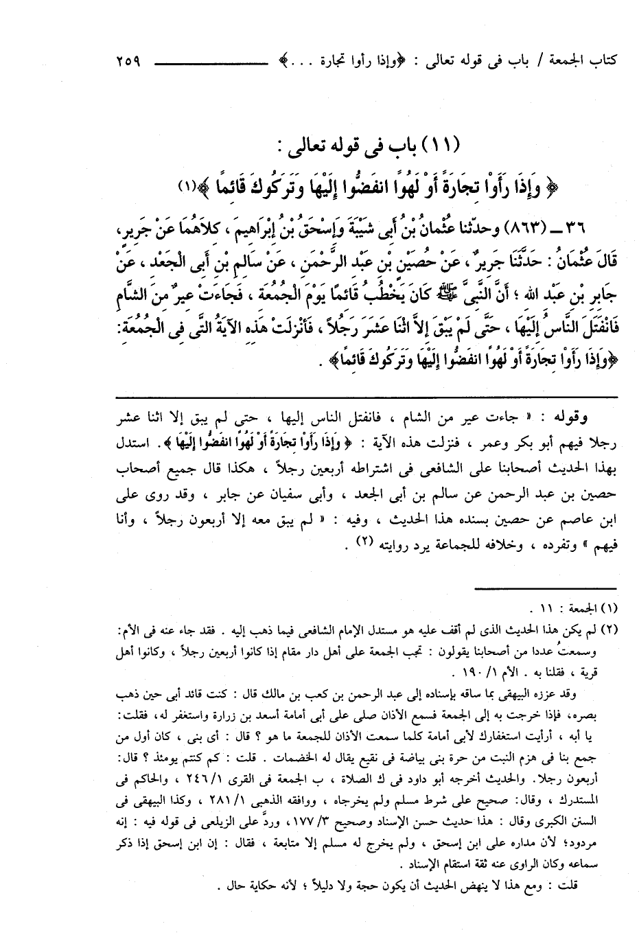 وقوله: " جاءت عير من الشام، فانفتل الناس إليها، حتى لم يبق إلا اثنا عشر رجلاً فيهم أبو بكر وعمر، فنزلت هذه الآية: {وَإِذَا رَأَوْا تِجَارَةً أَوْ لَهُوًا انفَضُّوا إِلَيْهَا}. استدل بهذا الحديث أصحابنا على الشافعى فى اشتراطه أربعين رجلاً، هكذا قال جميع أصحاب حصين بن عبد الرحمن عن سالم بن أبى الجعد، وأبى سفيان عن جابر، وقد روى على ابن عاصم عن حصين بسنده هذا الحديث، وفيه: " لم يبق معه إلا أربعون رجلاً، وأنا فيهم، وتفرده، وخلافه للجماعة يرد روايته (¬2).