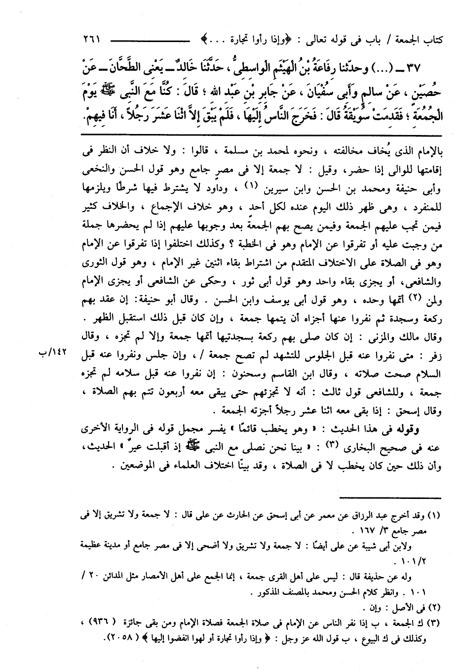 (¬3) ك الجمعة، ب إذا نفر الناس عن الإمام فى صلاة الجمعة فصلاة الإمام ومن بقى جائزة (936)، وكذلك فى ك البيوع، ب قول الله عز وجل: {وإذا رأوا تجارة أو لهوًا انفضوا إليها} (2058).