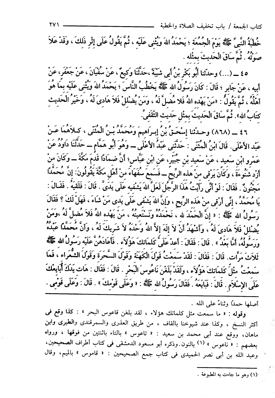 45 - (...) وحدّثنا أَبُو بَكْرِ بْنُ أَبِى شَيْبَة، حَدَّثَنَا وَكِيعٌ، عَنْ سُفْيَانَ، عَنْ جَعْفَرٍ، عَنْ أَبِيهِ، عَنْ جَابِرٍ؛ قَالَ: كَانَ رَسُولُ اللهِ صَلَّى اللهُ عَلَيْهِ وَسَلَّمَ يَخْطُبُ النَّاسَ؛ يَحْمَدُ اللهَ وُيثْنِى عَلَيْهِ بِمَا هُوَ أَهْلُهُ، ثُمَّ يَقُولُ: "مَنْ يَهْدِهِ اللهُ فَلا مُضِلَّ لَهُ، وَمَنْ يُضْلِلْ فَلَا هَادِىَ لَهُ، وَخَيْرُ الْحَدِيثِ كِتَابُ اللهِ ". ثُمَّ سَاقَ الْحَدِيثَ بِمِثْلِ حَدِيثِ الثّقَفِىِّ.