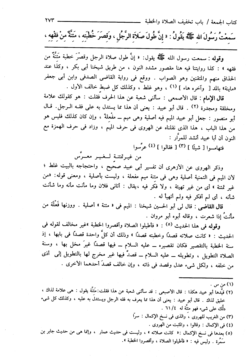 وقوله فى هذا الحديث (¬5): " فأطيلوا الصلاة وأقصروا الخطبة " غير مخالف لقوله فى الحديث: " كانت صلاته قصدًا وخطبته قصدًا " وذلك أن كلَّ واحدة قصدًا فى بابها، إذ سنة الخطبة بالتقصير فكان تقصيره - عليه السلام - فيها قصدًا غيرَ مخل بها، وسنة الصلاة التطويل، وتطويله - عليه السلام - قصدٌ فيها غير مخرج لها بالتطويل إلى أذى من خلفه، ولكل شىء عدل وقصد فى ذاته، وإن خالف قصدَ أحدهما الأخرى.