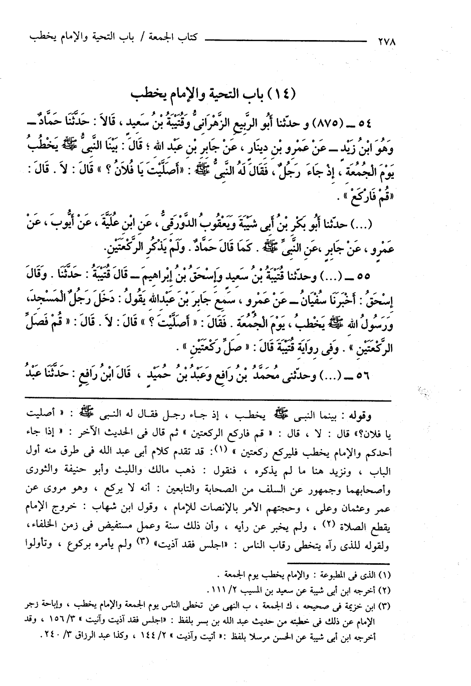 54 - (875) وحدّثنا أَبُو الرَّبِيعِ الزَّهْرَانِىُّ وَقُتَيْبَةُ بْنُ سَعِيدٍ، قَالَا: حَدَّثَنَا حَمَّادٌ - وَهُوَ ابْنُ زَيْدٍ - عَنْ عَمْرِو بْنِ دِينَارٍ، عَنْ جَابِرِ بْنِ عَبْدِ اللهِ؛ قَالَ: بَيْنَا النَّبِىُّ صَلَّى اللهُ عَلَيْهِ وَسَلَّمَ يَخْطُبُ يَوْمَ الْجُمُعَةِ، إِذْ جَاءَ رَجُلٌ، فَقَالَ لَهُ النَّبِىُّ صَلَّى اللهُ عَلَيْهِ وَسَلَّمَ: " أَصَلَّيْتَ يَا فُلَانُ؟ " قَالَ: لَا. قَالَ: " قُمْ فَارْكَعْ ".