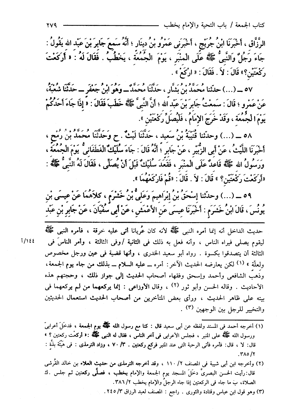 الرَّزَّاقِ، أَخْبَرَنَا ابْنُ جُرَيْجٍ، أَخْبَرَنِى عَمْرُو بْنُ دِينَارٍ؛ أَنَّهُ سَمِعَ جَابِرَ بْنَ عَبْدِ اللهِ يَقُولُ: جَاءَ رَجُلٌ وَالنَّبِىُّ صَلَّى اللهُ عَلَيْهِ وَسَلَّمَ عَلَى الْمِنْبَرِ، يَوْمَ الْجُمُعَةِ، يَخْطُبُ. فَقَالَ لَهُ: " أَرَكَعْتَ رَكْعَتَيْنِ؟ " قَالَ: لا. فَقَالَ: " ارْكَعْ ".
