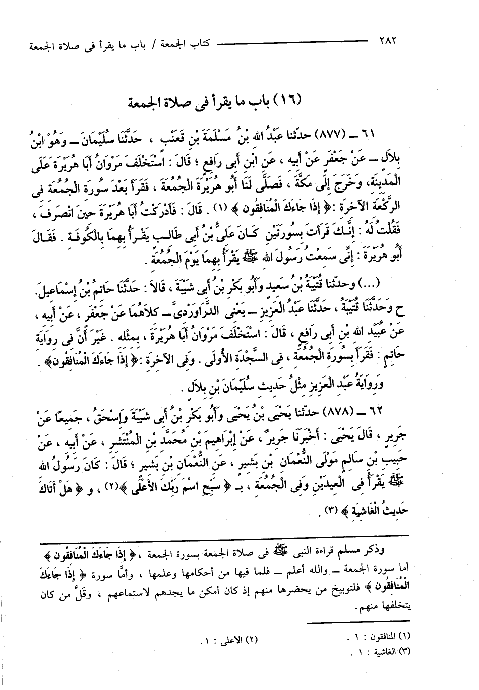 62 - (878) حدّثنا يَحْيَى بْنُ يَحْيَى وَأَبُو بَكْرِ بْنُ أَبِى شَيْبَةَ وَإِسْحَاقُ، جَمِيعًا عَنْ جَرِيرٍ، قَالَ يَحْيَى: أَخْبَرَنَا جَرِيرٌ، عَنْ إِبْرَاهِيمَ بْنِ مُحَمَّدِ بْنِ الْمُنْتَشِرِ، عَنْ أَبِيهِ، عَنْ حَبِيبِ بْن سَالِمٍ مَوْلَى النُّعْمَانِ بْنِ بَشِيرٍ، عَنِ النُّعْمَانِ بْنِ بَشِيرٍ؛ قَالَ: كَانَ رسُولُ اللهِ صَلَّى اللهُ عَلَيْهِ وَسَلَّمَ يَقْرَأُ فِى الْعِيدَيْنِ وَفِى الْجُمُعَةِ، بـ {سَبَّحَ اسْمَ رَبِّكَ الأَعْلَى} (¬2)، و {هَلْ أَتَاكَ حَدِيثُ الْغَاشِيَةِ} (¬3).