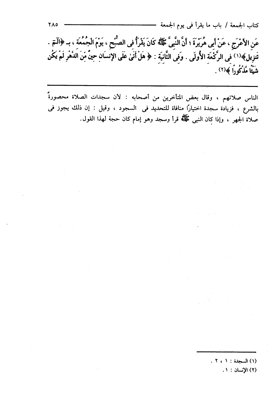 عَنِ الأَعْرَجِ، عَنْ أَبِى هُرَيْرَةَ؛ أَنَّ النَّبِىَّ صَلَّى اللهُ عَلَيْهِ وَسَلَّمَ كَانَ يَقْرَأُ فِى الصُّبْحِ، يَوْمَ الْجُمُعَةِ، بـ {آلم. تَنزِيل} (¬1) فِى الرَّكْعَةِ الأُولَى. وَفِى الثَّانِيَةِ: {هَلْ أَتَى عَلَى الإِنسَانِ حِينٌ مِّنَ الدَّهْرِ لَمْ يَكُن شَيْئًا مَّذْكُورًا} (¬2).