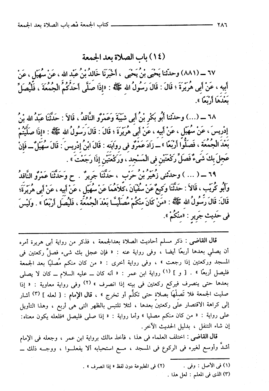 69 - (...) وحدَّثنى زُهَيْرُ بْنُ حَرْبٍ، حَدَّثَنَا جَرِيرٌ. ح وَحَدَّثَنَا عَمْرٌو النَّاقِدُ وَأَبُو كُرَيْبٍ، قَالَا: حَدَّثَنَا وَكِيعٌ عَنْ سُفْيَانَ، كِلَاهُمَا عَنْ سُهَيْلٍ، عَنْ أَبِيهِ، عَنْ أَبِى هُرَيْرَةَ؛ قَالَ: قَالَ رَسُولُ اللهِ صَلَّى اللهُ عَلَيْهِ وَسَلَّمَ: " مَنْ كَانَ مِنْكُمْ مُصَلِّيًّا بَعْدَ الْجُمُعَةِ، فَلْيُصَلِّ أَرْبَعًا ". وَليْسَ فى حَدِيثِ جَرِيرٍ: " مِنْكُمْ ".