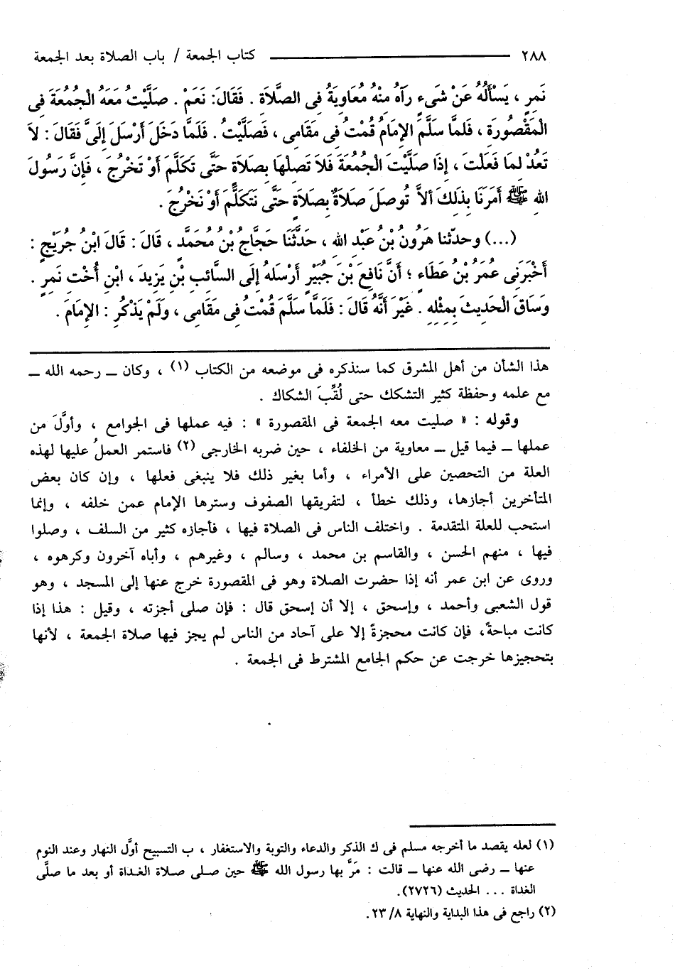 (...) وحدّثنا هَارُونُ بْنُ عَبْدِ اللهِ، حَدَّثَنَا حَجَّاجُ بْنُ مُحَمَّدٍ، قَالَ: قَالَ ابْنُ جُرَيْجٍ: أَخْبَرَنِى عُمَرُ بْنُ عَطَاءٍ؛ أَنَّ نَافِعَ بْنَ جُبَيْرٍ أَرْسَلهُ إِلَى السَّائِبِ بْنِ يَزِيدَ، ابْنِ أُخْتِ نَمِرٍ. وَسَاقَ الْحَدِيثَ بِمِثْلِهِ. غَيْرَ أَنَّهُ قَالَ: فَلَمَّا سَلَّمَ قُمْتُ فِى مَقَامِى، وَلَمْ يَذْكُرِ: الإِمَامَ.