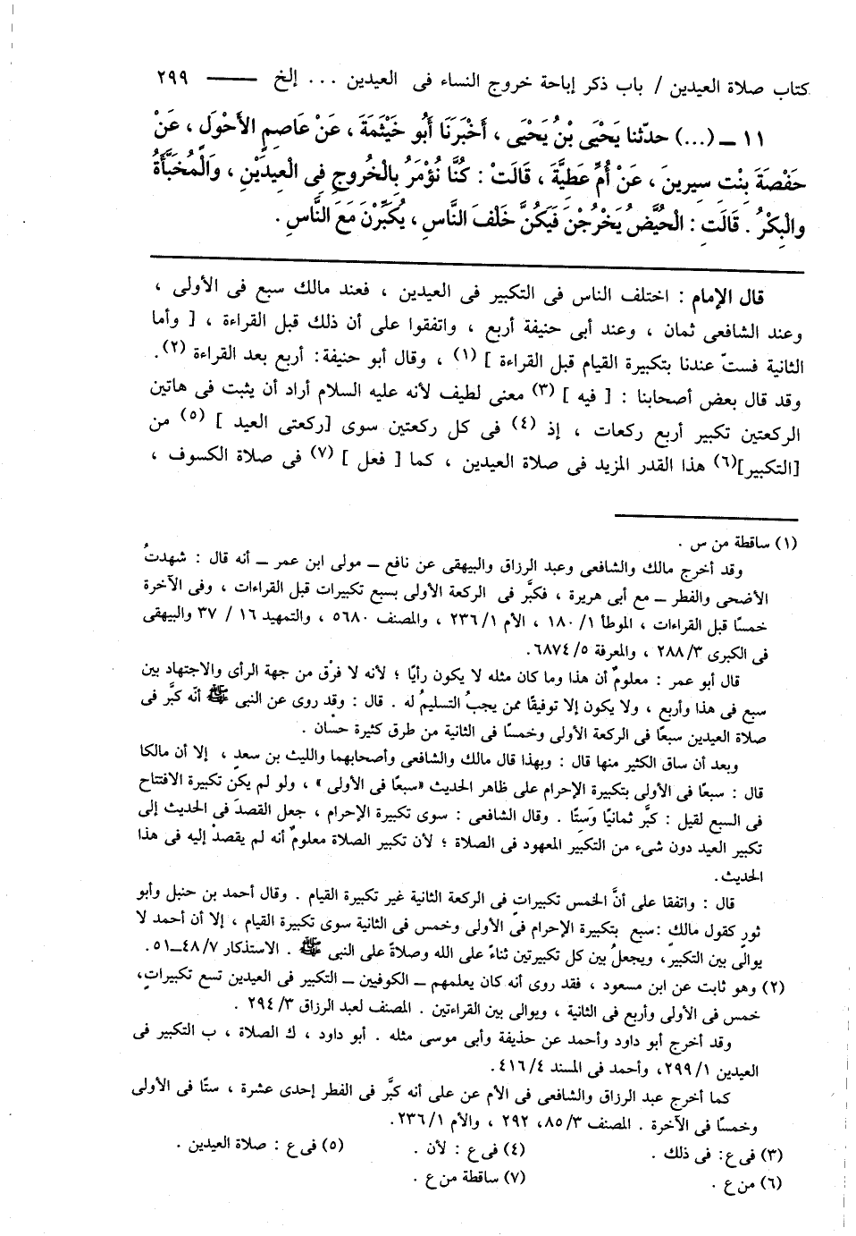 وبعد أن ساق الكثير منها قال: وبهذا قال مالك والشافعى وأصحابهما والليث بن سعدٍ، إلا أن مالكاً قال: سبعًا فى الأولى بتكبيرة الإحرام على ظاهر الحديث " سبعًا فى الأولى "، ولو لم يكن تكبيرة الافتتاح فى السبع لقيل: كبَّر ثمانيًا وَسِتًا. وقال الشافعى: سوى تكبيرة الإحرام، جعل القصدَ فى الحديث إلى تكبير العيد دون شىء من التكبير المعهود فى الصلاة؛ لأن تكبير الصلاة معلومٌ أنه لم يقصد إليه فى هذا الحديث.
