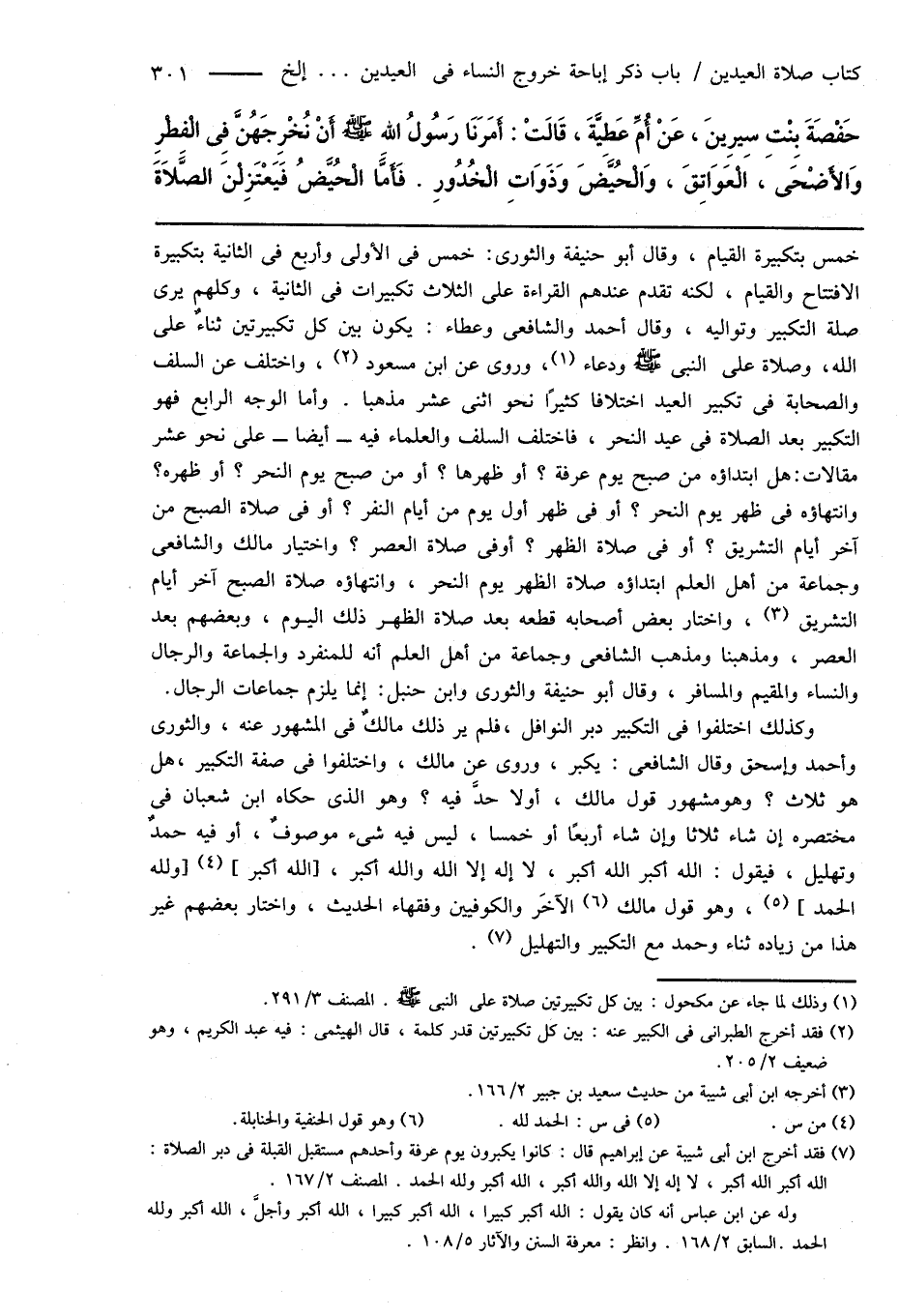 حَفْصَةَ بِنْتِ سِيرِينَ، عَنْ أُمِّ عَطِيَّةَ، قَالَتْ: أَمَرَنَا رَسُولُ اللهِ صَلَّى اللهُ عَلَيْهِ وَسَلَّمَ أَنْ نُخْرِجَهُنَّ فِى الْفِطْرِ وَالأَضْحَى، الْعَوَاتِقَ، وَالْحُيَّضَ وَذَوَاتِ الْخُدُورِ. فَأَمَّا الْحُيَّضُ فَيَعْتَزِلْنَ الصَّلَاةَ