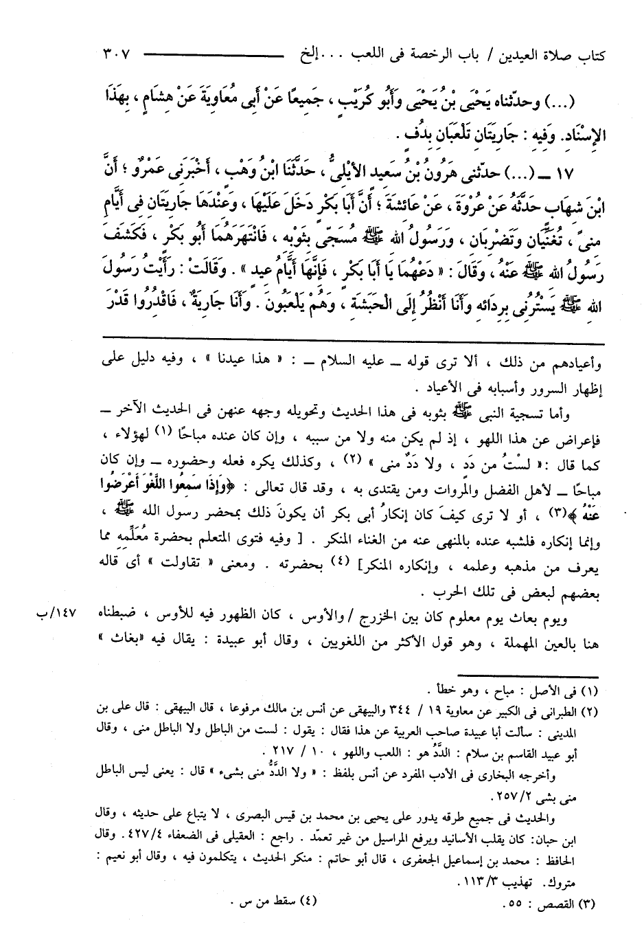 17 - (...) حدّثنى هَارُونُ بْنُ سَعِيدٍ الأَيْلِىُّ، حَدَّثَنَا ابْنُ وَهْبٍ، أَخْبَرَنِى عَمْرٌو؛ أَنَّ ابْنَ شِهَابٍ حَدَّثَهُ عَنْ عُرْوَةَ، عَنْ عَائِشَةَ؛ أَنَّ أَبَا بَكْرٍ دَخَلَ عَلَيْهَا، وَعِنْدَهَا جَارِيَتَانِ فِى أَيَّامِ مِنىً، تُغَنِّيَانِ وَتَضْرِبَانِ، وَرَسُولُ اللهِ صَلَّى اللهُ عَلَيْهِ وَسَلَّمَ مُسَجّى بِثَوْبِهِ، فَانْتَهَرَهُمَا أَبُو بَكْرٍ، فَكَشَفَ رَسُولُ اللهِ صَلَّى اللهُ عَلَيْهِ وَسَلَّمَ عَنْهُ، وَقَالَ: " دَعْهُمَا يَا أَبَا بَكْرٍ، فَإِنَّهَا أَيَّامُ عِيدٍ ". وَقَالَتْ: رَأَيْتُ رَسُولَ اللهِ صَلَّى اللهُ عَلَيْهِ وَسَلَّمَ يَسْتُرُنِى بِرِدَائِهِ وَأَنَا أَنْظُرُ إِلَى الْحَبَشَةِ، وَهُمْ يَلْعَبُونَ. وَأَنَا جَارِيَةٌ، فَاقْدِرُوا قَدْرَ