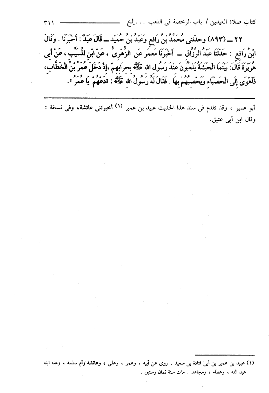 22 - (893) وحدَّثنى مُحَمَّدُ بْنُ رَافِعٍ وَعَبْدُ بْنُ حُمَيْدٍ - قَالَ عَبْدٌ: أَخْبَرَنَا. وَقَالَ ابْنُ رَافِعٍ: حَدَّثَنَا عَبْدُ الرَّزَّاقِ - أَخْبَرَنَا مَعمَر عَن الزُّهْرِىُّ، عَنْ ابْنِ المُسَيّبِ، عَنْ أَبِى هُرَيْرَةَ قَالَ: بَيْنَمَا الْحَبَشَةُ يَلْعَبُوَنَ عِنْدَ رَسُولِ اللهِ صَلَّى اللهُ عَلَيْهِ وَسَلَّمَ بِحِرَابِهِمْ، إِذْ دَخَلَ عُمَرُ بْنُ الخَطَّابِ، فَأَهْوَى إِلَى الْحَصْبَاءِ وَيَحْصِبُهُمْ بِهَا. فَقَالَ لَهُ رَسُولُ اللهِ صَلَّى اللهُ عَلَيْهِ وَسَلَّمَ: " دَعْهُمْ يَا عُمَرُ ".