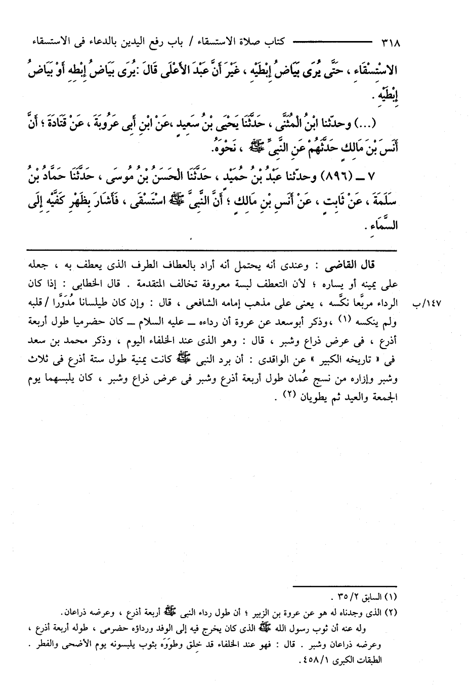 (¬2) الذى وجدناه له هو عن عروة بن الزبير؛ أن طول رداء النبى صَلَّى اللهُ عَلَيْهِ وَسَلَّمَ أربعة أذرع، وعرضه ذراعان. وله عنه أن ثوب رسول الله صَلَّى اللهُ عَلَيْهِ وَسَلَّمَ الذى كان يخرج فيه إلى الوفد ورداؤه حضرمى، طوله أربعة أذرع، وعرضه ذراعان وشبر. قال: فهو عند الخلفاء قد خِلق وطوَوَه بثوب يلبسونه يوم الأضحى والفطر. الطبقات الكبرى 1/ 458.