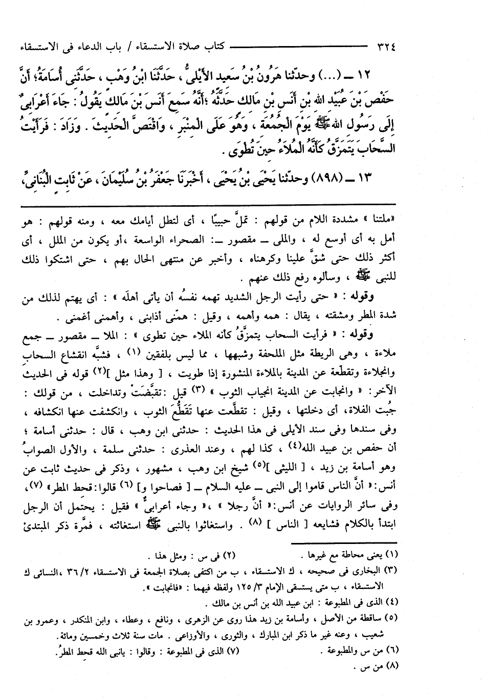 12 - (...) وحدّثنا هَارُونُ بْنُ سَعِيدٍ الأَيْلِىُّ، حَدَّثَنَا ابْنُ وَهْبٍ، حَدَّثَنِى أُسَامَةُ؛ أَنَّ حَفْصَ بْنَ عُبَيْدِ اللهِ بْنِ أَنَسِ بْنِ مَالِكٍ حَدَّثَهُ؛ أَنَّهُ سَمِعَ أَنَسَ بْنَ مَالِكٍ يَقُولُ: جَاءَ أَعْرَابِىٌّ إِلَى رَسُولِ اللهِ صَلَّى اللهُ عَلَيْهِ وَسَلَّمَ يَوْمَ الْجُمُعَةِ، وَهُوَ عَلَى الْمِنْبَرِ، وَاقْتَصَّ الْحَدِيثَ. وَزَادَ: فَرَأَيْتُ السَّحَابَ يَتَمَزَّقُ كَأَنَّهُ الْمُلَاءُ حِينَ تُطْوَى.