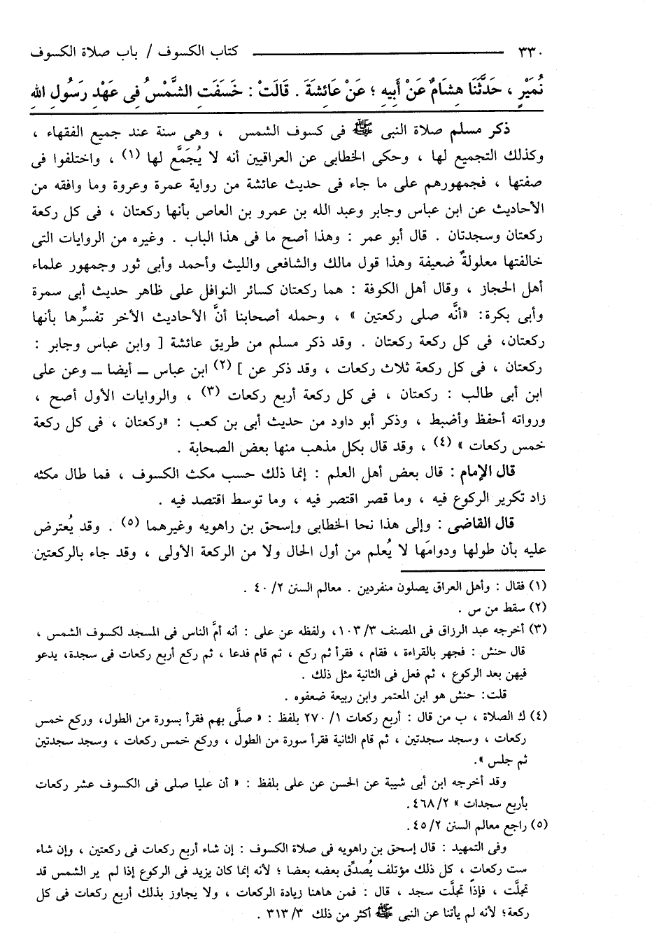ذكر مسلم صلاة النبى صَلَّى اللهُ عَلَيْهِ وَسَلَّمَ كسوف الشمس، وهى سنة عند جميع الفقهاء، وكذلك التجميع لها، وحكى الخطابى عن العراقيين أنه لا يُجَمَّع لها (¬1)، واختلفوا فى صفتها، فجمهورهم على ما جاء فى حديث عائشة من رواية عمرة وعروة وما وافقه من الأحاديث عن ابن عباس وجابر وعبد الله بن عمرو بن العاص بأنها ركعتان، فى كل ركعة ركعتان وسجدتان. قال أبو عمر: وهذا أصح ما فى هذا الباب. وغيره من الروايات التى خالفتها معلولةٌ ضعيفة وهذا قول مالك والشافعى والليث وأحمد وأبى ثور وجمهور علماء أهل الحجاز، وقال أهل الكوفة: هما ركعتان كسائر النوافل على ظاهر حديث أبى سمرة وأبى بكرة: " أنَّه صلى ركعتين "، وحمله أصحابنا أنَّ الأحاديث الأخر تفسِّرها بأنها ركعتان، فى كل ركعة ركعتان. وقد ذكر مسلم من طريق عائشة [وابن عباس وجابر: ركعتان، فى كل ركعة ثلاث ركعات، وقد ذكر عن] (¬2) ابن عباس - أيضاً - وعن على ابن أبى طالب: ركعتان، فى كل ركعة أربع ركعات (¬3)، والروايات الأول أصح، ورواته أحفظ وأضبط، وذكر أبو داود من حديث أبى بن كعب: " ركعتان، فى كل ركعة خمس ركعات " (¬4)، وقد قال بكل مذهب منها بعض الصحابة.