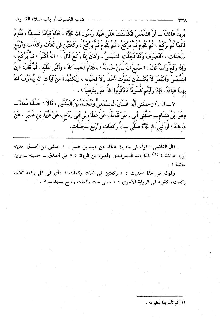 يُرِيدُ عَائِشَةَ - أَنَّ الشَّمْسَ انْكَسَفَتْ عَلَى عَهْدِ رَسُولِ اللهِ صَلَّى اللهُ عَلَيْهِ وَسَلَّمَ، فَقَامَ قِيَامًا شَدِيدًا، يَقُومُ قَائِمًا ثُمَّ يَرْكَعُ، ثُمَّ يَقُومُ ثُمَّ يَرْكَعُ، ثُمَّ يَقُومُ ثُمَّ يَرْكَعُ، رَكْعَتَيْنِ فِى ثَلَاثِ رَكَعَاتٍ وَأَرْبَعِ سَجَدَاتٍ، فَانْصَرَفَ وَقَدْ تَجَلَّتِ الشَّمْسُ، وَكَانَ إِذَا رَكَعَ قَالَ: " اللهُ أَكْبَرُ " ثُمَّ يَرْكَعُ، وَإِذَا رَفَعَ رَأسَهُ قَالَ: " سَمِعَ اللهُ لِمَنْ حَمِدَهُ "، فَقَامَ فَحَمِدَ اللهَ، وَأَثْنَى عَلَيْهِ. ثُمَّ قَالَ: " إِنَّ الشَّمْسَ وَالْقَمَرَ لا يَكْسِفَانِ لِمَوْتِ أَحَدٍ وَلا لِحَيَاتِهِ، وَلكِنَّهُما مِنْ آيَاتِ اللهِ يُخَوِّفُ اللهُ بِهِمَا عِبَادَهُ، فَإِذَا رَأَيْتُمْ كُسُوفًا فَاذْكُرُوا اللهَ حَتَّى يَنْجَلِيَا ".
