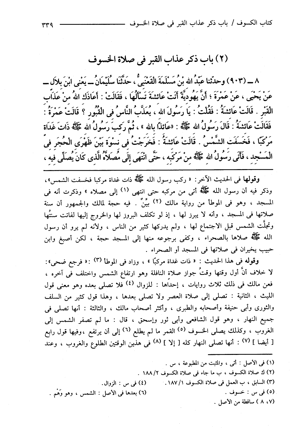 8 - (903) وحدّثنا عَبْدُ اللهِ بْنُ مَسْلَمَةَ الْقَعْنَبِىُّ، حَدَّثَنَا سُلَيْمَانُ - يَعْنِى ابْنَ بِلَالٍ - عَنْ يَحْيَى، عَنْ عَمْرَةَ؛ أَنَّ يَهُودِيَّةً أَتَتْ عَائِشَةَ تَسْأَلُهَا، فَقَالَتْ: أَعَاذَكِ اللهُ مِنْ عَذَابِ الْقَبْرِ. قَالَتْ عَائِشَةُ: فَقُلْتُ: يَا رَسُولَ اللهِ، يُعَذَّبُ النَّاسُ فِى الْقُبُورِ؟ قَالَتْ عَمْرَةُ: فَقَالَتْ عَائِشَةُ: قَالَ رَسُولُ اللهِ صَلَّى اللهُ عَلَيْهِ وَسَلَّمَ: " عَائِذًا بِاللهِ "، ثُمَّ رَكِبَ رَسُولُ اللهِ صَلَّى اللهُ عَلَيْهِ وَسَلَّمَ ذَاتَ غَدَاةٍ مَرْكَبًا، فَخَسَفَتِ الشَّمْسُ. قَالَتْ عَائِشَةُ: فَخَرَجْتُ فِى نِسْوَة بَيْنَ ظَهْرَىِ الْحُجَرِ فِى الْمَسْجِدِ، فَأَتَى رَسُولُ اللهِ صَلَّى اللهُ عَلَيْهِ وَسَلَّمَ مِنْ مَرْكبِهِ، حَتَّى انْتَهَى إِلَى مُصَلَّاهُ الَّذِى كَانَ يُصَلِّى فِيهِ،