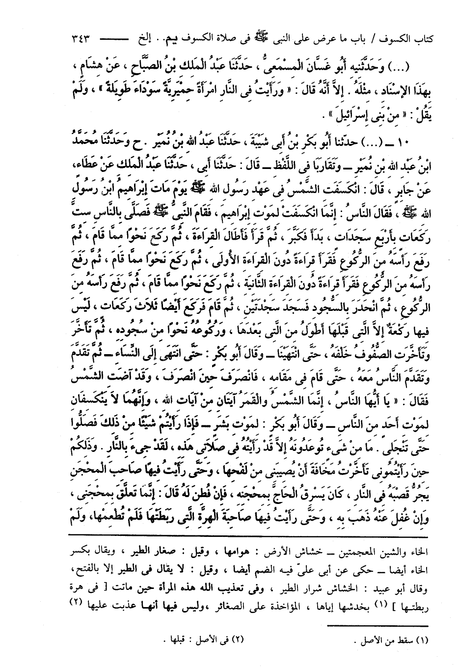 10 - (...) حدّثنا أَبُو بَكْرِ بْن أَبِى شَيْبَةَ، حَدَّثَنَا عَبْدُ اللهِ بْنِ نُمَيْرٍ. ح وَحَدَّثَنَا مُحَمَّدُ ابْنُ عَبْدِ اللهِ بْنِ نُمَيْرٍ - وَتَقَارَبَا فى اللَّفْظِ - قَالَ: حَدَّثَنَا أَبِى، حَدَّثَنَا عَبْدُ الْمَلِكِ عَنْ عَطَاءٍ، عَنْ جَابِرٍ، قَالَ: انْكَسَفَتِ الشَّمْسُ فِى عَهْدِ رَسُولِ اللهِ صَلَّى اللهُ عَلَيْهِ وَسَلَّمَ يَوْمَ مَاتَ إِبْرَاهِيمُ ابْنُ رَسُولِ اللهِ صَلَّى اللهُ عَلَيْهِ وَسَلَّمَ، فَقَالَ النَّاسُ: إِنَّمَا انْكَسَفَتْ لِمَوْتِ إِبْرَاهِيمَ، فَقَامَ النَّبِىُّ صَلَّى اللهُ عَلَيْهِ وَسَلَّمَ فَصَلَّى بِالنَّاسِ سِتَّ رَكَعَاتٍ بِأَرْبَعِ سَجَدَاتٍ، بَدَأَ فَكَبَّرَ، ثُمَّ قَرَأَ فَأَطَالَ الْقِرَاءَةَ، ثُمَّ رَكَعَ نَحْوًا مِمَّا قَامَ، ثُمَّ رَفَعَ رَأسَهُ منَ الرُّكُوعِ فَقَرَأَ قِرَاءَةً دُونَ الْقِرَاءَةِ الأُولَى، ثُمَّ رَكَعَ نَحْوًا مِمَّا قَامَ، ثُمَّ رَفَعَ رَأسَهُ مِنَ الرُّكُوعِ فَقَرَأَ قِرَاءَةً دُونَ الْقِرَاءَةِ الثَّانِيَةِ، ثُمَّ رَكَعَ نَحْوًا مِمَّا قَامَ، ثُمَّ رفَعَ رَأسَهُ مِنَ الرُّكُوعِ، ثُمَّ انْحَدَرَ بِالسُّجُودِ فَسَجَدَ سَجْدَتَيْنِ، ثُمَّ قَامَ فَرَكَعَ أَيْضًا ثَلَاثَ رَكَعَاتٍ، لَيْسَ فِيها رَكْعَةٌ إِلَّا الَّتِى قَبْلَهَا أَطَوَلُ مِنَ الَّتِى بَعْدَهَا، وَرُكُوعُهُ نَحْوًا مِنْ سُجُودِهِ، ثُمَّ تَأَخَّرَ وَتَأَخَّرَتِ الصُّفُوفُ خَلْفَهُ، حَتَّى انْتَهَيْنَا - وَقَالَ أَبُو بَكْرٍ: حَتَّى انْتَهَى إِلَى النِّسَاءِ - ثُمَّ تَقَدَّمَ وَتَقَدَّمَ النَّاسُ مَعَهُ، حَتَّى قَامَ فِى مَقَامِهِ، فَانْصَرَفَ حِينَ انْصَرَفَ، وَقَدْ آضَتِ الشَّمْسُ فَقَالَ: " يَا أَيُّهَا النَّاسُ، إِنَّمَا الشَّمْسُ والْقَمَرُ آيَتَانِ مِن آيَاتِ اللهِ، وَإِنَّهُمَا لَا يَنْكَسِفَانِ لِمَوْتِ أَحَدٍ مِنَ النَّاسِ - وَقَالَ أَبُو بَكْرٍ: لِمَوْتِ بَشَرٍ - فَإِذَا رَأَيْتُمْ شَيْئًا مِنْ ذَلِكَ فَصَلُّوا حَتَّى تَنْجَلِى. مَا مِنْ شَىْءٍ تُوعَدُونَهُ إِلَّا قَدْ رَأَيْتُهُ فِى صَلَاتِى هَذِهِ، لَقَدْ جِىءَ بِالنَّارِ. وَذَلِكُمْ حِينَ رَأَيْتُمُونِى تَأَخَّرْتُ مَخَافَةَ أَنْ يُصِيبَنِى مِنْ لَفْحِهَا، وَحَتَّى رَأَيْتُ فِيهَا صَاحِبَ الْمِحْجَنِ يَجُرُّ قَصْبَهُ فِى النَّارِ، كَانَ يَسْرِقُ الْحَاجَّ بِمِحْجَنِهِ، فَإِنْ فُطِنَ لَهُ قَالَ: إِنَّمَا تَعلَّقَ بِمِحْجَنِى، وَإِنْ غُفِلَ عَنْهُ ذَهَبَ بِهِ، وَحَتَّى رَأَيْتُ فِيهَا صَاحِبَةَ الْهِرَّةِ الَّتِى رَبَطَتْهَا فَلَمْ تُطْعِمْهَا، وَلَمْ