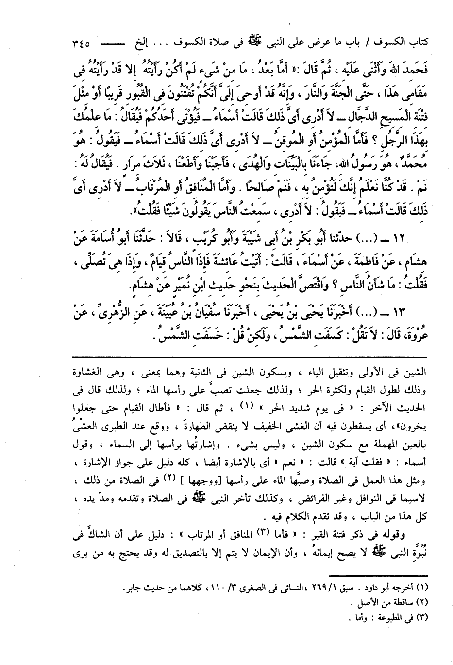 12 - (...) حدّثنا أَبُو بَكْرِ بْنُ أَبِى شَيْبَةَ وَأَبُو كُرَيْبٍ، قَالَا: حَدَّثَنَا أَبُو أُسَامَةَ عَنْ هِشَام، عَنْ فَاطِمَةَ، عَنْ أَسْمَاءَ، قَالَتْ: أَتَيْتُ عَائِشَةَ فَإِذَا النَّاسُ قِيَامٌ، وَإِذَا هِىَ تُصَلِّى، فَقُلْتُ: مَا شَأنُ النَّاسِ؟ وَاقْتَصَّ الْحَدِيثَ بِنَحْوِ حَدِيثِ ابْنِ نُمَيْرٍ عَنْ هِشَامٍ.