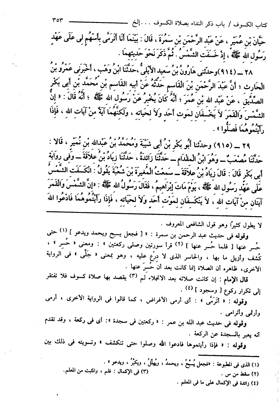29 - (915) وحدّثنا أَبُو بَكْرِ بْنُ أَبِى شَيْبَةَ وَمُحَمَّدُ بْنُ عَبْدِ اللهِ بْنِ نُمَيْرٍ، قَالا: حَدَّثَنَا مُصْعَبٌ - وَهُوَ ابْنُ الْمِقْدَامِ - حَدَّثَنَا زَائِدَةُ، حَدَّثَنَا زِيَادُ بْن عِلَاقَةَ - وَفِى رِوَايَةِ أَبِى بَكْرٍ قَالَ: قَالَ زِيَادُ بْنُ عِلَاقَةَ - سَمِعْتُ الْمُغِيرَةَ بْنَ شُعْبَةَ يَقُولُ: انْكَسَفَتِ الشَّمْسُ عَلَى عَهْدِ رَسُولِ اللهِ، يَوْمَ مَاتَ إِبْرَاهِيمُ، فَقَالَ رَسُولُ اللهِ صَلَّى اللهُ عَلَيْهِ وَسَلَّمَ: " إِنَّ الشَّمْسَ وَالْقَمَرَ آيَتَانِ مِنْ آيَاتِ اللهِ، لا يَنْكَسِفَانِ لِمَوْتِ أَحَدٍ وَلَا لِحَيَاتِهِ، فَإِذَا رَأَيْتُمُوهُمَا فَادْعُوا اللهَ