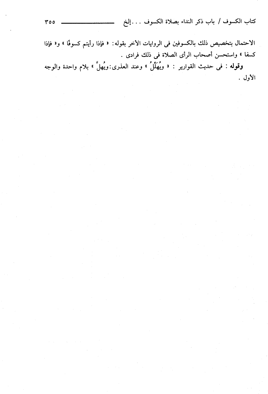 الاحتمال بتخصيص ذلك بالكسوفين فى الروايات الأخر بقوله: " فإذا رأيتم كسوفًا " و " فإذا كسفاً " واستحسن أصحاب الرأى الصلاة فى ذلك فرادى.