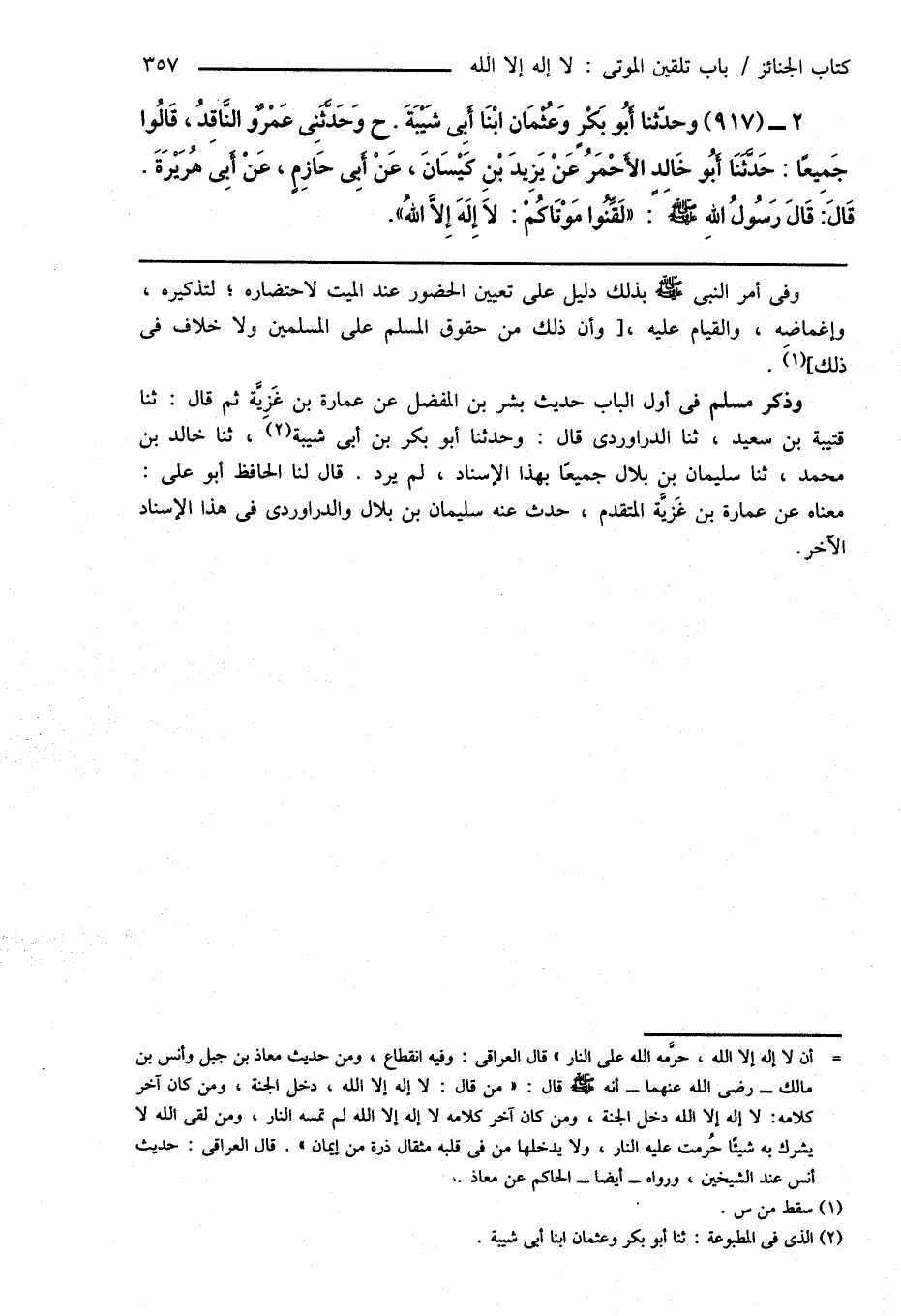 2 - (917) وحدّثنا أَبُو بَكْرٍ وَعُثْمَان ابْنَا أَبِى شَيْبَةَ. ح وَحَدَّثَنِى عَمْرٌو النَّاقِدُ، قَالُوا جَمِيعًا: حَدَّثَنَا أَبُو خَالِدٍ الأَحْمَرُ عَنْ يَزِيدَ بْنِ كَيْسَانَ، عَنْ أَبِى حَازِمٍ، عَنْ أَبِى هُرَيْرَةَ. قَالَ. قَالَ رَسُولُ اللهِ صَلَّى اللهُ عَلَيْهِ وَسَلَّمَ: " لَقِّنُوا مَوْتَاكُمْ: لا إِلَهَ إِلَّا اللهُ ".
