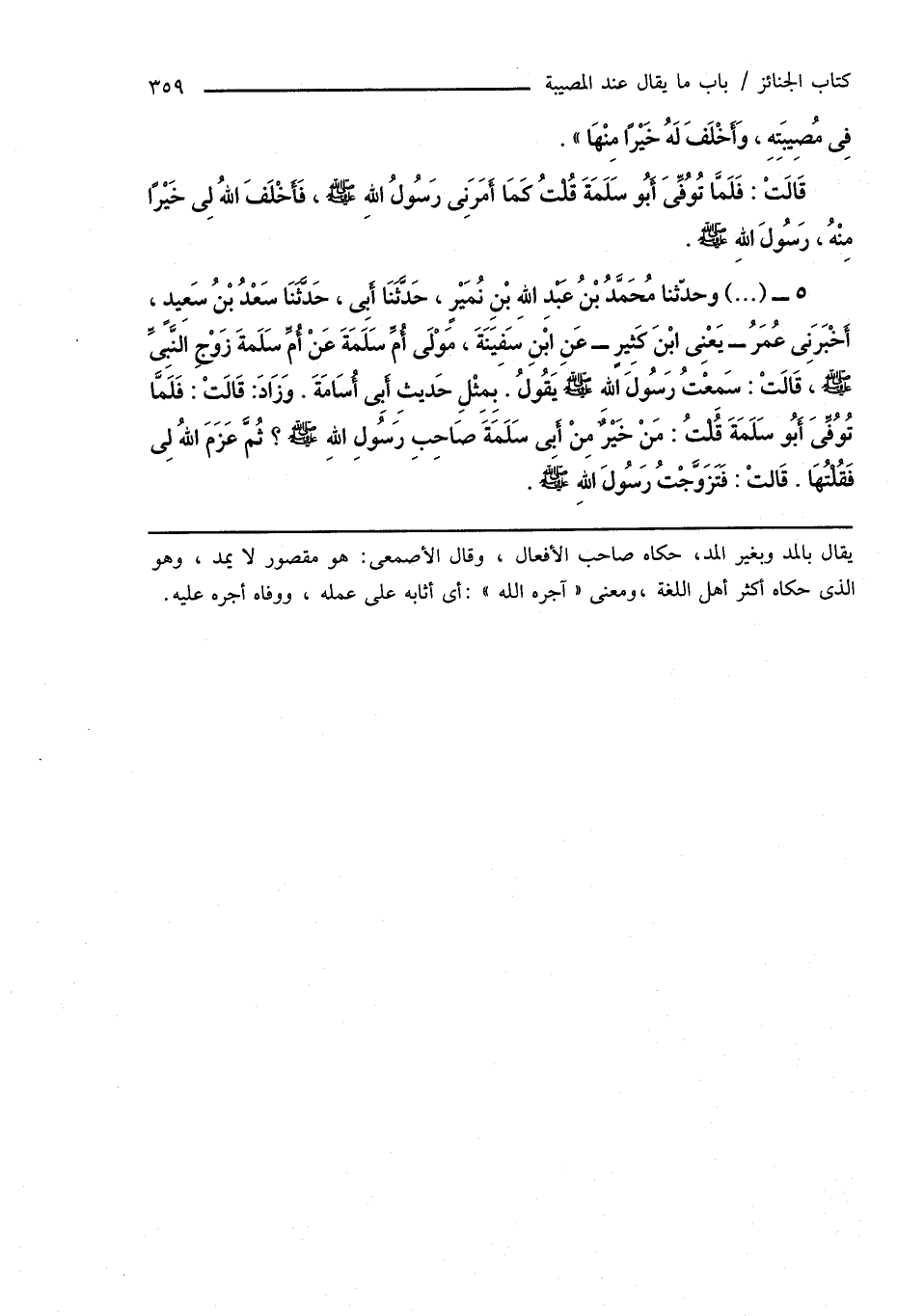 5 - (...) وحدّثنا مُحَمَّدُ بْنُ عَبْدِ اللهِ بْنِ نُمَيْرٍ، حَدَّثَنَا أَبِى، حَدَّثَنَا سَعْدُ بْنُ سَعِيدٍ، أَخْبَرَنِى عُمَرُ - يَعْنِى ابْنَ كَثِيرٍ - عَنِ ابْنِ سَفِيَنَةَ، مَوْلَى أُمِّ سَلَمَةَ عَنْ أُمِّ سَلَمَةَ زَوْجِ النَّبِىِّ صَلَّى اللهُ عَلَيْهِ وَسَلَّمَ، قَالَتْ: سَمِعْتُ رَسُولَ اللهِ صَلَّى اللهُ عَلَيْهِ وَسَلَّمَ يَقُولُ. بِمِثْلِ حَدِيثِ أَبِى أُسَامَةَ. وَزَادَ: قَالَتْ: فَلَمَّا تُوُفِّىَ أَبُو سَلَمَةَ قُلْتُ: مَنْ خَيْرٌ مِنْ أَبِى سَلَمَةَ صَاحِبِ رَسُولِ اللهِ صَلَّى اللهُ عَلَيْهِ وَسَلَّمَ؟ ثُمَّ عَزَمَ اللهُ لِى فَقُلْتُهَا. قَالَتْ: فَتَزَوَّجْتُ رَسُولَ اللهِ صَلَّى اللهُ عَلَيْهِ وَسَلَّمَ.