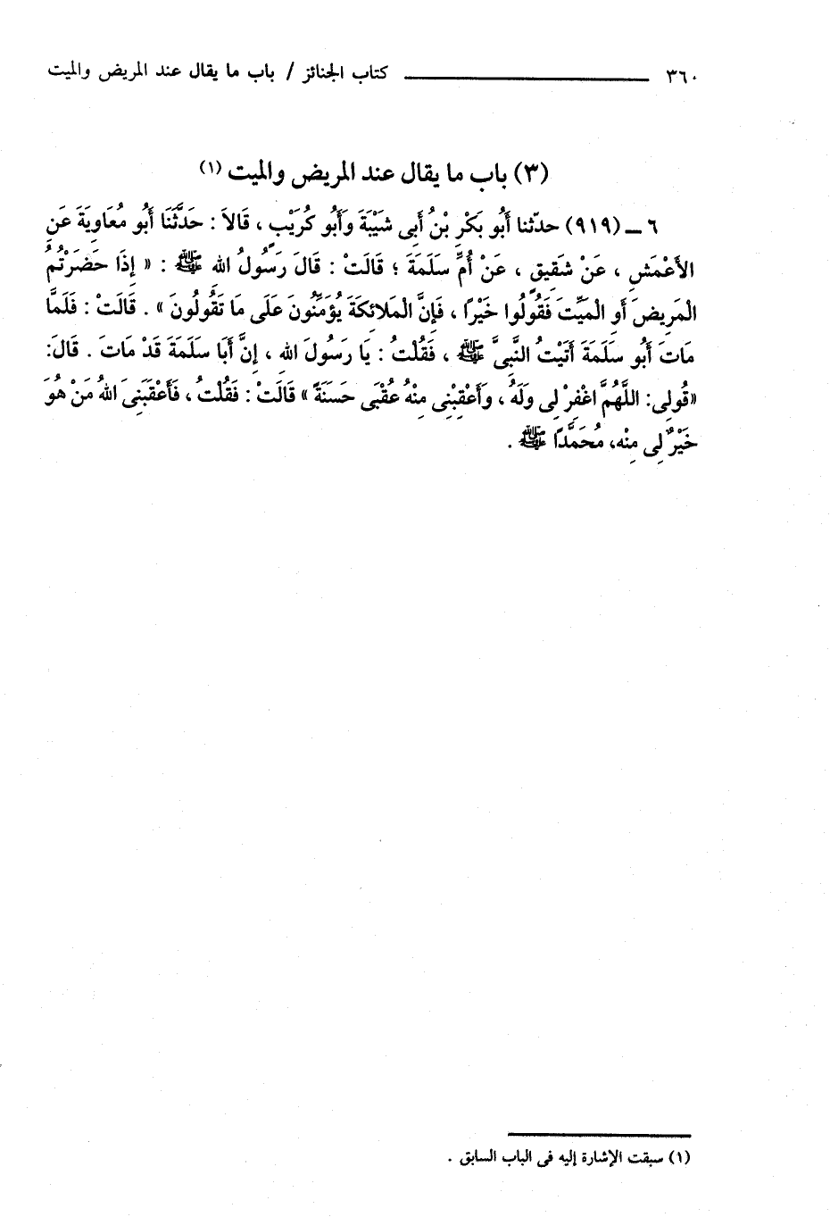 6 - (919) حدّثنا أَبُو بَكْرِ بْنُ أَبِى شَيْبَةَ وَأَبُو كُرَيْبٍ، قَالَا: حَدَّثَنَا أَبُو مُعَاوِيَةَ عَنِ الأَعْمَشِ، عَنْ شَقِيقٍ، عَنْ أُمِّ سَلَمَةَ؛ قَالَتْ: قَالَ رَسُولُ اللهِ صَلَّى اللهُ عَلَيْهِ وَسَلَّمَ: " إِذَا حَضَرْتُمُ الْمَرِيضَ أَوِ الْمَيِّتَ فَقُولُوا خَيْرًا، فَإِنَّ الْمَلَائِكَةَ يُؤَمِّنُونَ عَلَى مَا تَقُولُونَ ". قَالَتْ: فَلَمَّا مَاتَ أَبُو سَلَمَةَ أَتَيْتُ النَّبِىَّ صَلَّى اللهُ عَلَيْهِ وَسَلَّمَ، فَقُلْتُ: يَا رَسُولَ اللهِ، إِنَّ أَبَا سَلَمَةَ قَدْ مَاتَ. قَالَ: " قُولِى: اللَّهُمَّ اغْفِرْ لِى وَلَهُ، وَأَعْقِبْنِى مِنْهُ عُقْبَى حَسَنَةً " قَالَتْ: فَقُلْتُ، فَأَعْقَبَنِىَ اللهُ مَنْ هُوَ خَيْرٌ لِى مِنْه، مُحَمَّدًا صَلَّى اللهُ عَلَيْهِ وَسَلَّمَ.