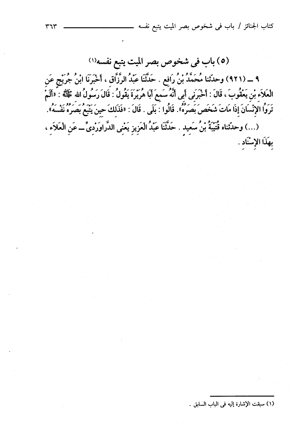 9 - (921) وحدّثنا مُحَمَّدُ بْنُ رَافِعٍ. حَدَّثَنَا عَبْدُ الرَّزَّاقِ، أَخْبَرَنَا ابْنُ جُرَيْجٍ عَنِ الْعَلَاءِ بْنِ يَعْقُوبَ، قَالَ: أَخْبَرَنِى أَبِى أَنَّهُ سَمِعَ أَبَا هُرَيْرَةَ يَقُولُ: قَالَ رَسولُ اللهِ صَلَّى اللهُ عَلَيْهِ وَسَلَّمَ: " أَلَمْ تَرَوُا الإِنْسَانَ إِذَا مَاتَ شَخَصَ بَصَرُهُ ". قَالُوا: بَلَى. قَالَ: " فَذَلِكَ حِينَ يَتْبَعُ بَصَرُهُ نَفْسَهُ ".