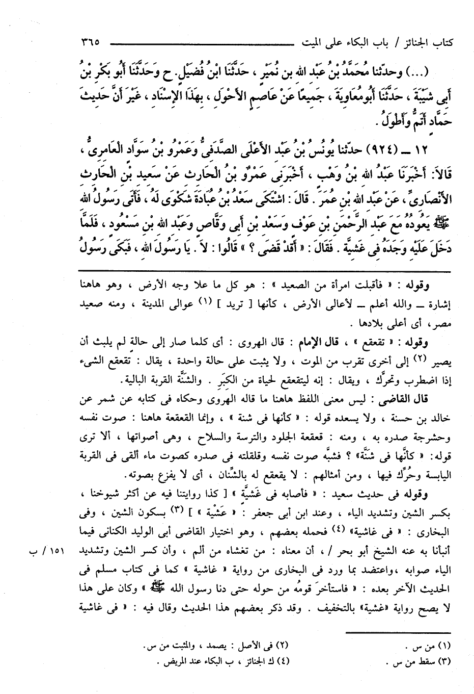 12 - (924) حدّثنا يُونُسُ بْنُ عَبْدِ الأَعْلَى الصَّدَفِىُّ وَعَمْرُو بْنُ سَوَّادٍ الْعَامِرِىُّ، قَالَا: أَخْبَرَنَا عَبْدُ اللهِ بْنُ وَهْبٍ، أَخْبَرَنِى عَمْرٌو بْنُ الْحَارِث عَنْ سَعِيدِ بْنِ الْحَارِثِ الأَنْصَارِىِّ، عَنْ عبدِ اللهِ بْنِ عُمَرَ. قَالَ: اشْتَكَى سَعْدُ بْنُ عُبَادَةَ شَكْوَى لَهُ، فَأَتَى رَسُولُ اللهِ صَلَّى اللهُ عَلَيْهِ وَسَلَّمَ يَعُودُهُ مَعَ عَبْدِ الرَّحْمَنِ بْنِ عَوْفٍ وَسَعْدِ بْنِ أَبِى وَقَّاصٍ وَعَبْدِ اللهِ بْنِ مَسْعُودٍ، فَلَمَّا دَخَلَ عَلَيْهِ وَجَدَهُ فِى غَشِيَّة. فَقَالَ: " أَقدْ قَضَى؟ " قَالُوا: لَا. يَا رَسُولَ اللهِ، فَبَكَى رَسُولُ