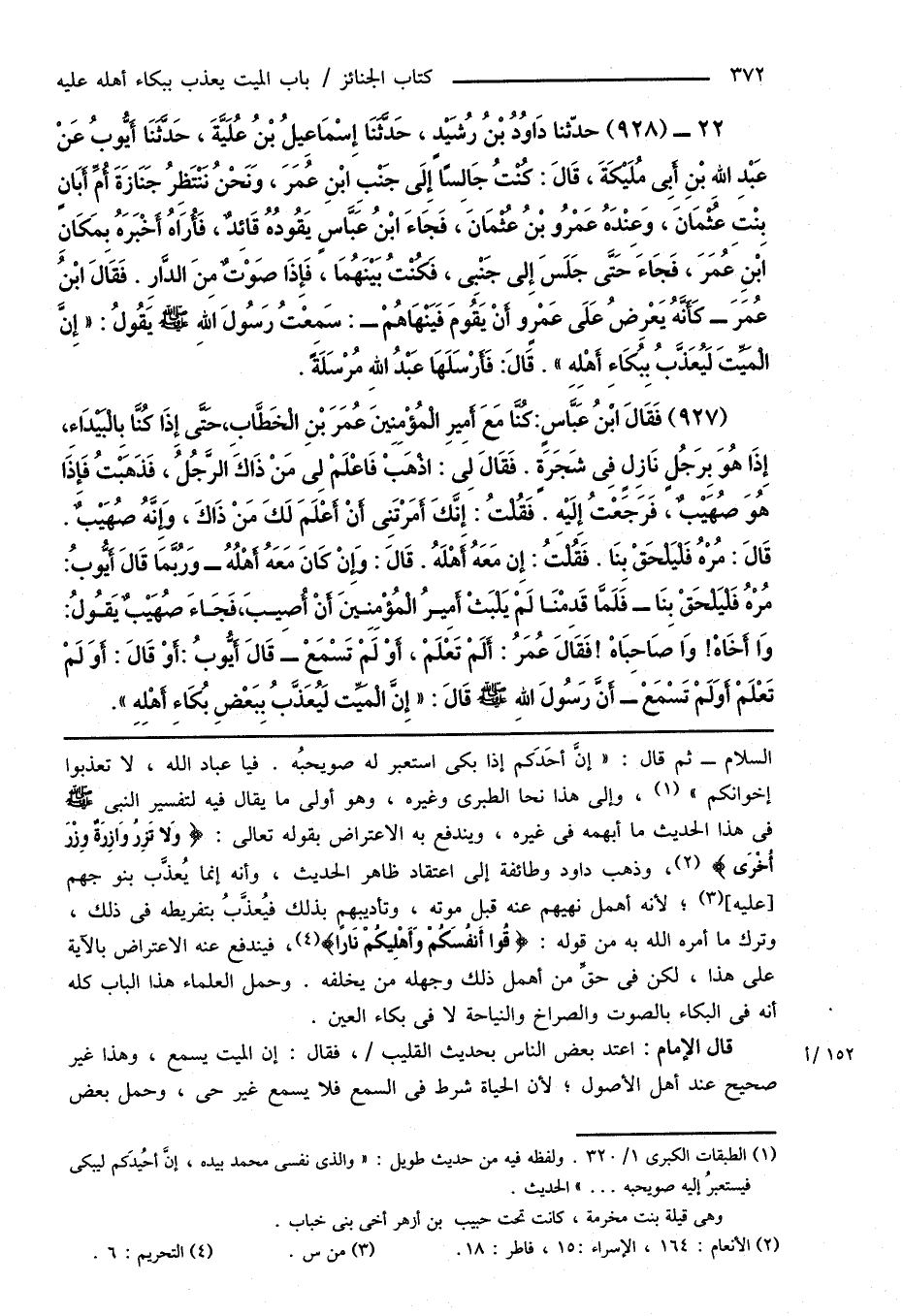 (927) فَقَالَ ابْنُ عَبَّاسٍ: كُنَّا مَعَ أَمِيرِ الْمُؤْمِنِينَ عُمَرَ بْنِ الْخَطَّابِ، حَتَّى إِذَا كُنَّا بِالْبَيْدَاءِ، إِذَا هُوَ بِرَجُلٍ نَازِلٍ فِى شَجَرَةٍ. فَقَالَ لِى: اذْهَبْ فَاعْلَمْ لِى مَنْ ذَاكَ الرَّجُلُ، فَذَهَبْتُ فَإِذَا هُوَ صُهَيْبٌ، فَرَجَعْتُ إِلَيْهِ. فَقُلْتُ: إِنَّكَ أَمَرْتَنِى أَنْ أَعْلَمَ لَكَ مَنْ ذَاكَ، وَإِنَّهُ صُهَيْبٌ. قَالَ: مُرْهُ فَلْيَلْحَقْ بِنَا. فَقُلْتُ: إِنَّ مَعَهُ أَهْلَهُ. قَالَ: وَإِنْ كَانَ مَعَهُ أَهْلُهُ - وَرُبَّمَا قَالَ أَيُّوبُ: مُرْهُ فَلْيَلْحَقْ بِنَا - فَلَمَّا قَدِمْنَا لَمْ يَلْبَثْ أَمِيرُ الْمُؤْمِنِينَ أَنْ أُصِيبَ، فَجَاءَ صُهَيْبٌ يَقُولُ: وَا أَخَاهْ! وَا صَاحِبَاهْ! فَقَالَ عُمَرُ: أَلَمْ تَعْلَمْ، أَوْ لَمْ تَسْمَعْ - قَالَ أَيُّوبُ: أَوْ قَالَ: أوَ لَمْ تَعْلَمْ أَوَ لَمْ تَسْمَعْ - أَنَّ رَسُولَ اللهِ صَلَّى اللهُ عَلَيْهِ وَسَلَّمَ قَالَ: " إِنَّ الْمَيِّت لَيُعَذَّبُ بِبَعْضِ بُكَاءِ أَهْلِهِ ".