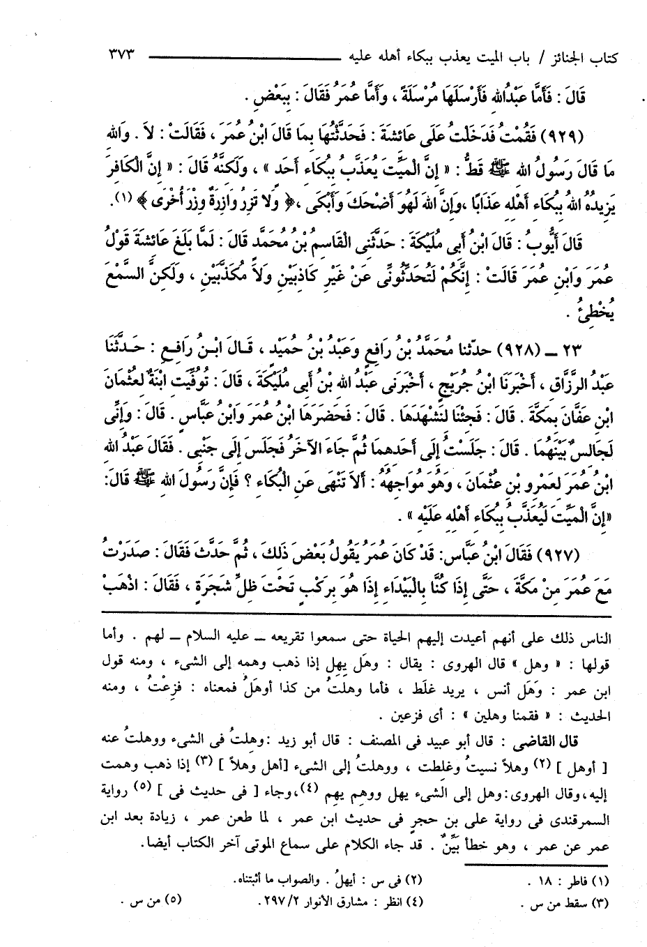 (929) فَقُمْتُ فَدَخَلْتُ عَلَى عَائِشَةَ: فَحَدَّثْتُهَا بِمَا قَالَ ابْنُ عُمَرَ، فَقَالَتْ: لَا. وَاللهِ مَا قَالَ رَسُولُ اللهِ صَلَّى اللهُ عَلَيْهِ وَسَلَّمَ قَطُّ: " إِنَّ الْمَيِّتَ يُعَذَّبُ بِبُكَاءِ أَحَدٍ "، وَلَكِنَّهُ قَالَ: " إِنَّ الْكَافِرَ يَزِيدُهُ اللهُ بِبُكَاءِ أَهْلِهِ عَذَابًا، وَإِنَّ اللهَ لَهُوَ أَضْحَكَ وَأَبْكَى، {وَلَا تَزِر وَازِرَةٌ وِزْرَ أُخْرَى} (¬1).