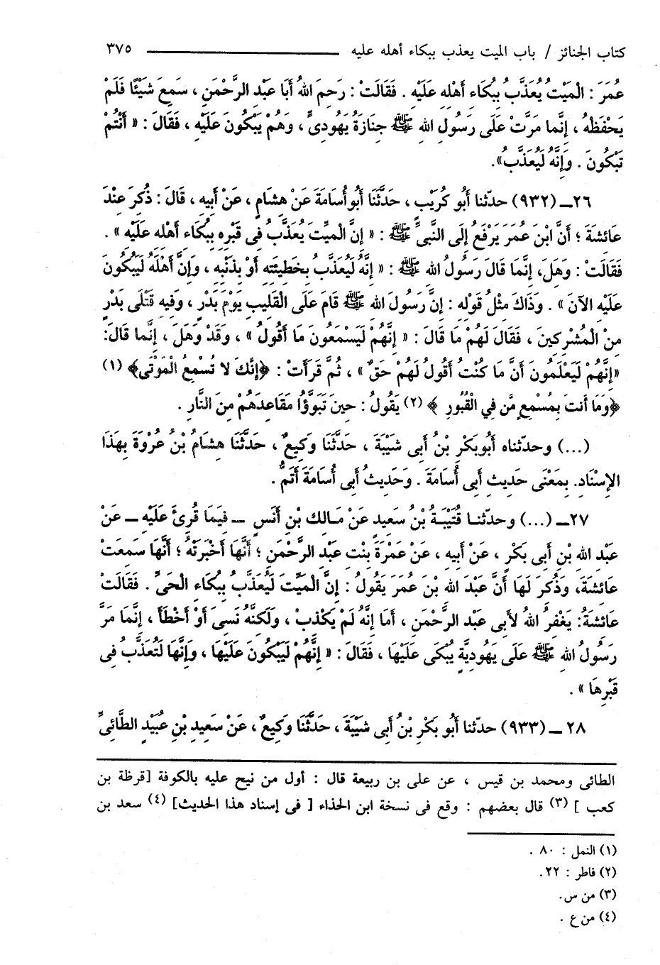 26 - (932) حدّثنا أَبُو كُرَيْبٍ، حَدَّثَنَا أَبُو أُسَامَةَ عَنْ هِشَامٍ، عَنْ أَبِيهِ، قَالَ: ذُكِرَ عِنْدَ عَائِشَةَ؛ أَنَّ ابْنَ عُمَرَ يَرْفَعُ إِلَى النَّبىِّ صَلَّى اللهُ عَلَيْهِ وَسَلَّمَ: " إِنَّ الْمَيِّتَ يُعَذَّبُ فِى قَبْرِهِ بِبُكَاءِ أَهْلِهِ عَلَيْهِ ". فَقَالَتْ: وَهَلَ، إِنَّمَا قَالَ رسُولُ اللهِ صَلَّى اللهُ عَلَيْهِ وَسَلَّمَ: " إِنَّهُ لَيُعَذَّبُ بِخَطِيئَتِهِ أَوْ بِذَنْبِهِ، وَإِنَّ أَهْلَهُ لَيَبُكُونَ عَلَيْهِ الآنَ ". وَذَاكَ مِثْلُ قَوْلِهِ: إِنَّ رَسُولَ اللهِ صَلَّى اللهُ عَلَيْهِ وَسَلَّمَ قَامَ عَلَى الْقَلِيبِ يَوْمَ بَدْرٍ، وَفِيهِ قَتْلَى بَدْرٍ مِنْ الْمُشْرِكِينَ، فَقَالَ لَهُمْ مَا قَالَ: " إِنَّهُمْ لَيَسْمَعُونَ مَا أَقُولُ "، وقَدْ وَهَلَ، إِنَّمَا قَالَ: " إِنَّهُمْ لَيَعْلَمُونَ أَنَّ مَا كُنْتُ أَقُولُ لَهُمْ حَقٌّ "، ثُمَّ قَرَأَتْ: {إِنَّكَ لا تُسْمِعُ الْمَوْتَى} (¬1) {وَمَا أَنتَ بِمُسْمِعٍ مَّن فِي الْقُبُورِ} (¬2) يَقُولُ: حِينَ تَبَوَّؤُا مَقَاعِدَهُمْ مِنَ النَّارِ.