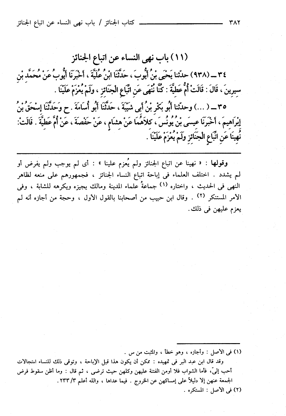 34 - (938) حدّثنا يَحْيَى بْنُ أَيُّوبَ، حَدَّثَنَا ابْنُ عُلَيَّةَ، أَخْبَرَنَا أَيُّوبُ عَنْ مُحَمَّدِ بْنِ سِيرِينَ، قَالَ: قَالَتْ أُمُّ عَطِيَّةَ: كُنَّا نُنْهَى عَنِ اتِّباَعِ الْجَنَائِزِ، وَلَمْ يُعْزَمْ عَلَيْنَا.