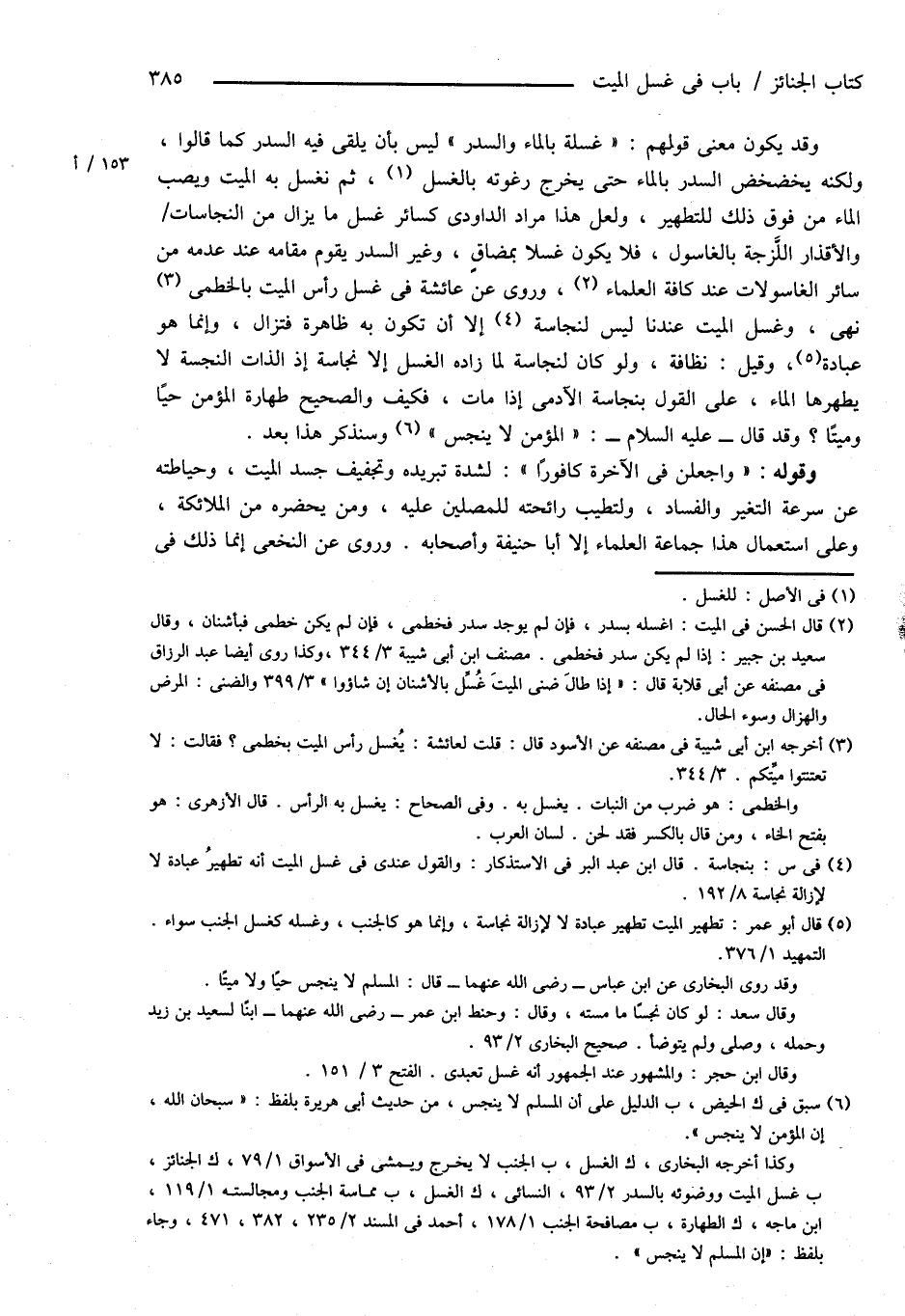 (¬5) قال أبو عمر: تطهير الميت تطهير عبادة لا لإزالة نجاسة، وإنما هو كالجنب، وغسله كغسل الجنب سواء. التمهيد 1/ 376.