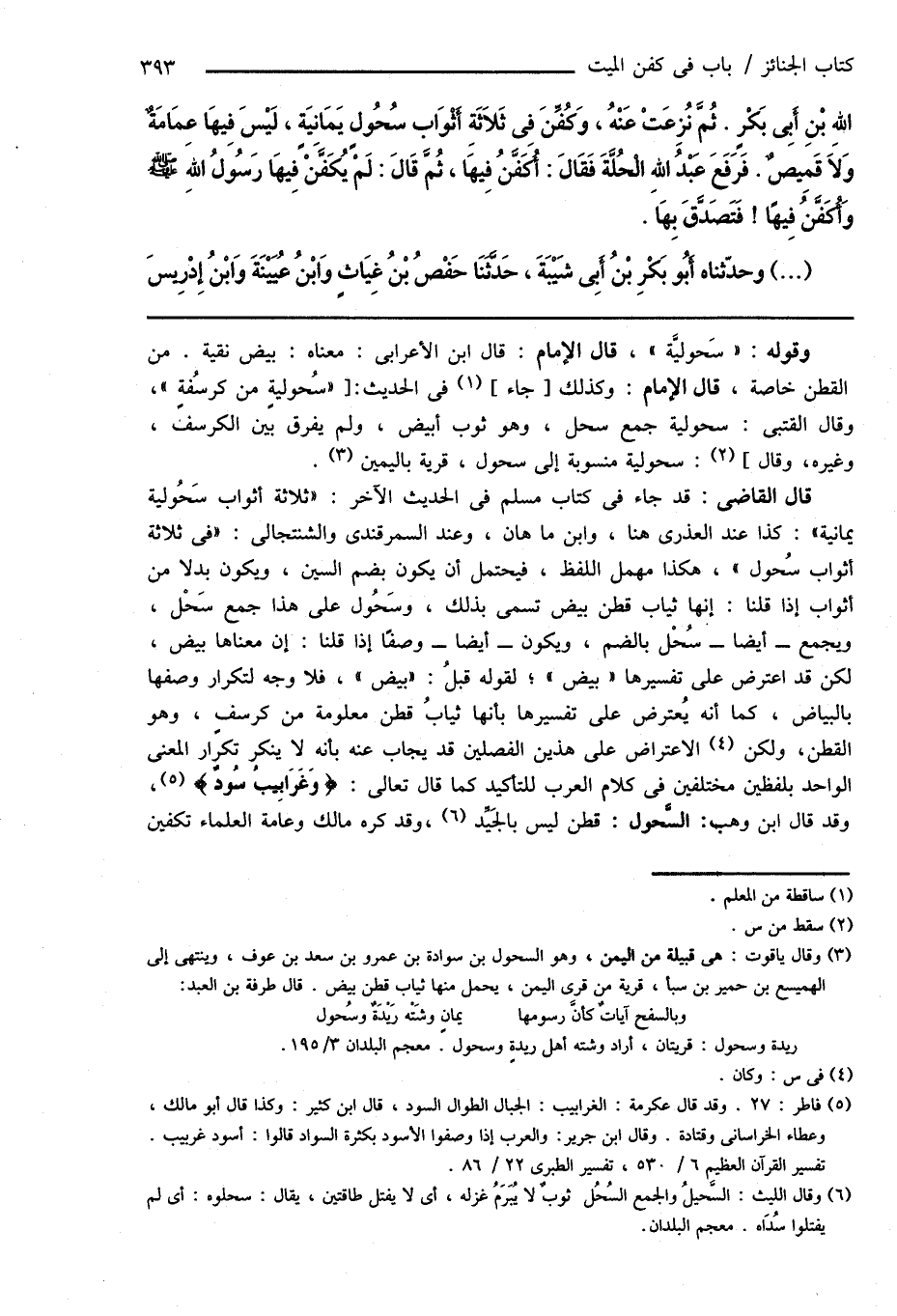 قال القاضى: قد جاء فى كتاب مسلم فى الحديث الآخر: " ثلاثة أثواب سَحُولية يمانية ": كذا عند العذرى هنا، وابن ماهان، وعند السمرقندى والشنتجالى: " فى ثلاثة أثواب سُحول "، هكذا مهمل اللفظ، فيحتمل أن يكون بضم السين، ويكون بدلاً من أثواب إذا قلنا: إنها ثياب قطن بيض تسمى بذلك، وسَحُول على هذا جمع سَحْل، ويجمع - أيضاً - سُحْل بالضم، ويكون - أيضاً - وصفًا إذا قلنا: إن معناها بيض، لكن قد اعترض على تفسيرها " بيض "؛ لقوله قبلُ: " بيض "، فلا وجه لتكرار وصفها بالبياض، كما أنه يُعترض على تفسيرها بأنها ثيابُ قطن معلومة من كرسفٍ، وهو القطن، ولكن (¬4) الاعتراض على هذين الفصلين قد يجاب عنه بأنه لا ينكر تكرار المعنى الواحد بلفظين مختلفين فى كلام العرب للتأكيد كما قال تعالى: {وَغَرَابِيبُ سُودٌ} (¬5)، وقد قال ابن وهب: السَّحول: قطن ليس بالجَيِّد (¬6)، وقد كره مالك وعامة العلماء تكفين