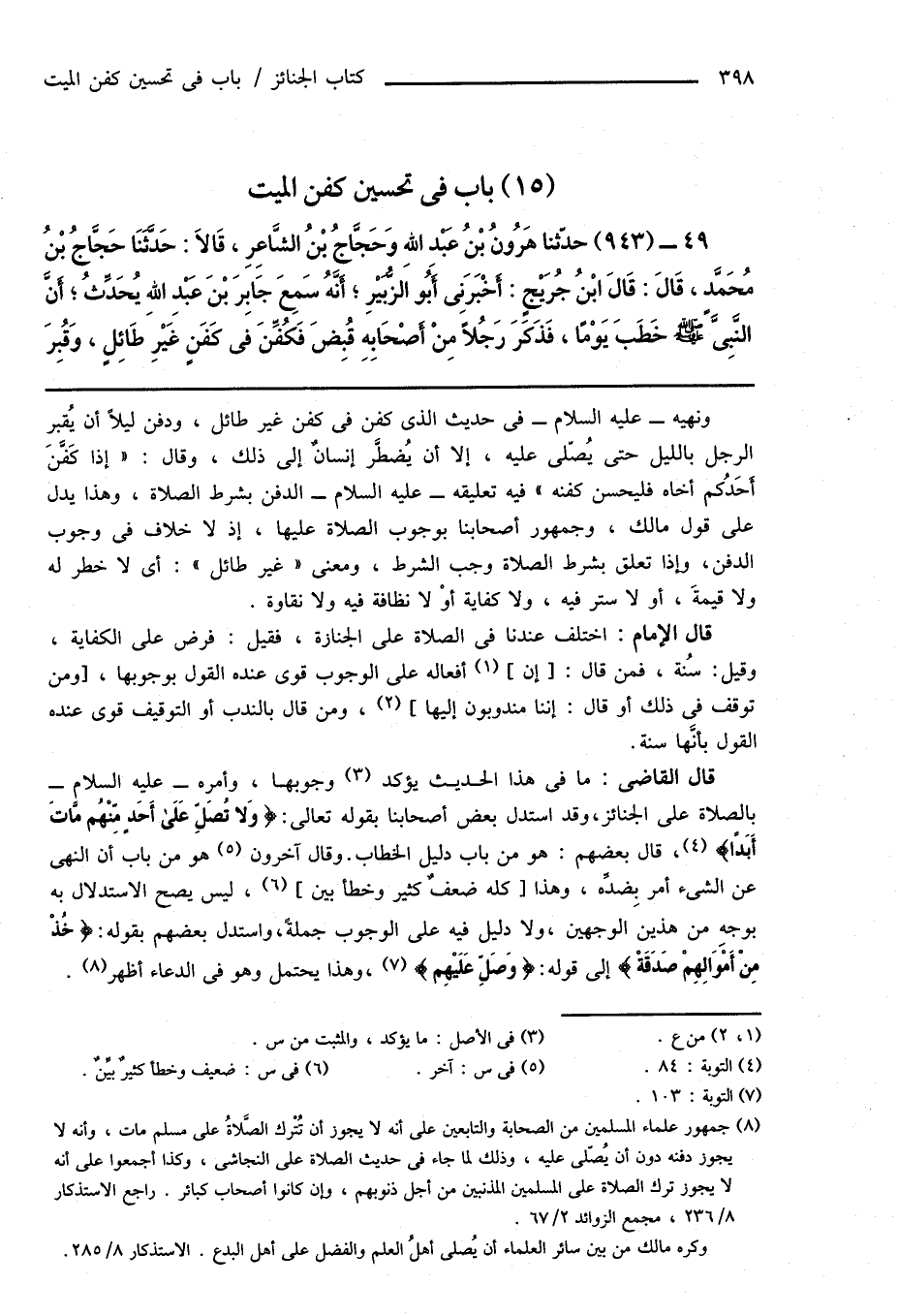 (¬8) جمهور علماء المسلمين من الصحابة والتابعين على أنه لا يجوز أن تُتْرك الصَّلاةُ على مسلم مات، وأنه لا يجوز دفنه دون أن يُصلى عليه، وذلك لما جاء فى حديث الصلاة على النجاشى، وكذا أجمعوا على أنه لا يجوز ترك الصلاة على المسلمين المذنبين من أجل ذنوبهم، وإن كانوا أصحاب كبائر. راجع الاستذكار 8/ 236، مجمع الزوائد 2/ 67.