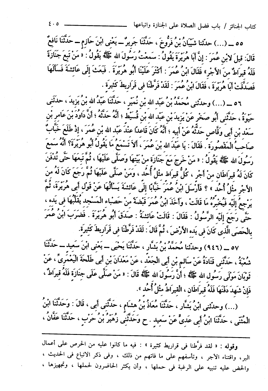 55 - (...) حدّثنا شَيْبَانُ بْنُ فَرُّوخَ، حَدَّثَنَا جَرِيرٌ - يَعْنِى ابْنَ حَازِمٍ - حَدَّثَنَا نَافِعٌ قَالَ: قِيلَ لابْنِ عُمَرَ: إِنَّ أَبَا هُرَيْرَةَ يَقُولُ: سَمِعْتُ رَسُولَ اللهِ صَلَّى اللهُ عَلَيْهِ وَسَلَّمَ يَقُولُ: " مَنْ تَبِعَ جَنَازَةً فَلَهُ قِيرَاطٌ مِنَ الأَجْرِ " فَقَالَ ابْنُ عُمَرَ: أَكْثَرَ عَلَيْنَا أَبُو هُرَيْرَةَ. فَبَعَثَ إِلَى عَائِشَةَ فَسَأَلَهَا فَصَدَّقَتْ أَبَا هُرَيْرَةَ، فَقَالَ ابْنُ عُمَرَ: لَقَدْ فَرَّطْنَا فِى قَرَارِيطَ كَثِيرَةٍ.