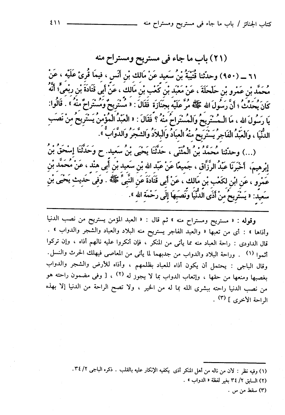 (...) وحدّثنا مُحَمَّدُ بْنُ الْمُثَنَّى، حَدَّثَنَا يَحْيَى بْنُ سَعِيدٍ. ح وَحَدَّثَنَا إِسْحَاقُ بْنُ إِبْرَاهِيمَ، أَخْبَرَنَا عَبْدُ الرَّزَّاقِ، جَمِيعًا عَنْ عَبْدِ اللهِ بْنِ سَعِيدٍ بْنِ أَبِى هِنْدٍ، عَنْ مُحَمَّدِ بْنِ عَمْرٍو، عَنِ ابْنِ لِكَعْبِ بْنِ مَالِكٍ، عَنْ أَبِى قَتَادَةَ عَنِ النَّبِىِّ صَلَّى اللهُ عَلَيْهِ وَسَلَّمَ. وَفِى حَدِيثِ يَحْيَى بْنِ سَعِيدٍ: " يَسْتَرِيحُ مِنْ أَذَى الدُّنْيَا وَنَصَبِهَا إِلَى رَحْمَةِ اللهِ ".