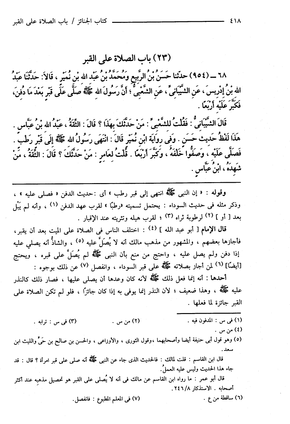 قَالَ الشَّيْبَانِىُّ: فَقُلْتُ لِلشَّعْبِىِّ: مَنْ حَدَّثَكَ بِهَذَا؟ قَالَ: الثِّقَةُ، عَبْدُ اللهِ بْنُ عَبَّاسٍ. هَذَا لَفْظُ حَدِيثِ حَسَنٍ. وَفى رِوَايَةِ ابْنِ نُمَيْرٍ قَالَ: انْتَهَى رَسُولُ اللهِ صَلَّى اللهُ عَلَيْهِ وَسَلَّمَ إِلَى قَبْرٍ رَطْبٍ. فَصَلَّى عَلَيْهِ، وَصَفُّوا خَلْفَهُ، وَكَبَّرَ أَرْبَعًا. قُلْتُ لِعَامِرٍ: مَنْ حَدَّثَكَ؟ قَالَ: الثِّقَةُ، مَنْ شَهِدَهُ، ابْنُ عَبَّاسٍ.